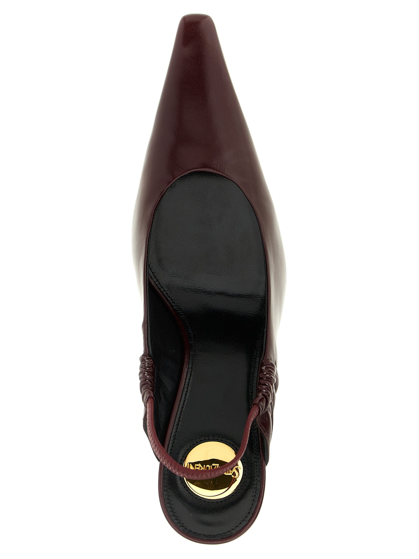 'Anne-Marie' smooth leather slingbacks with elongated square toe, elastic curled strap, oblique stiletto heel, leather sole.