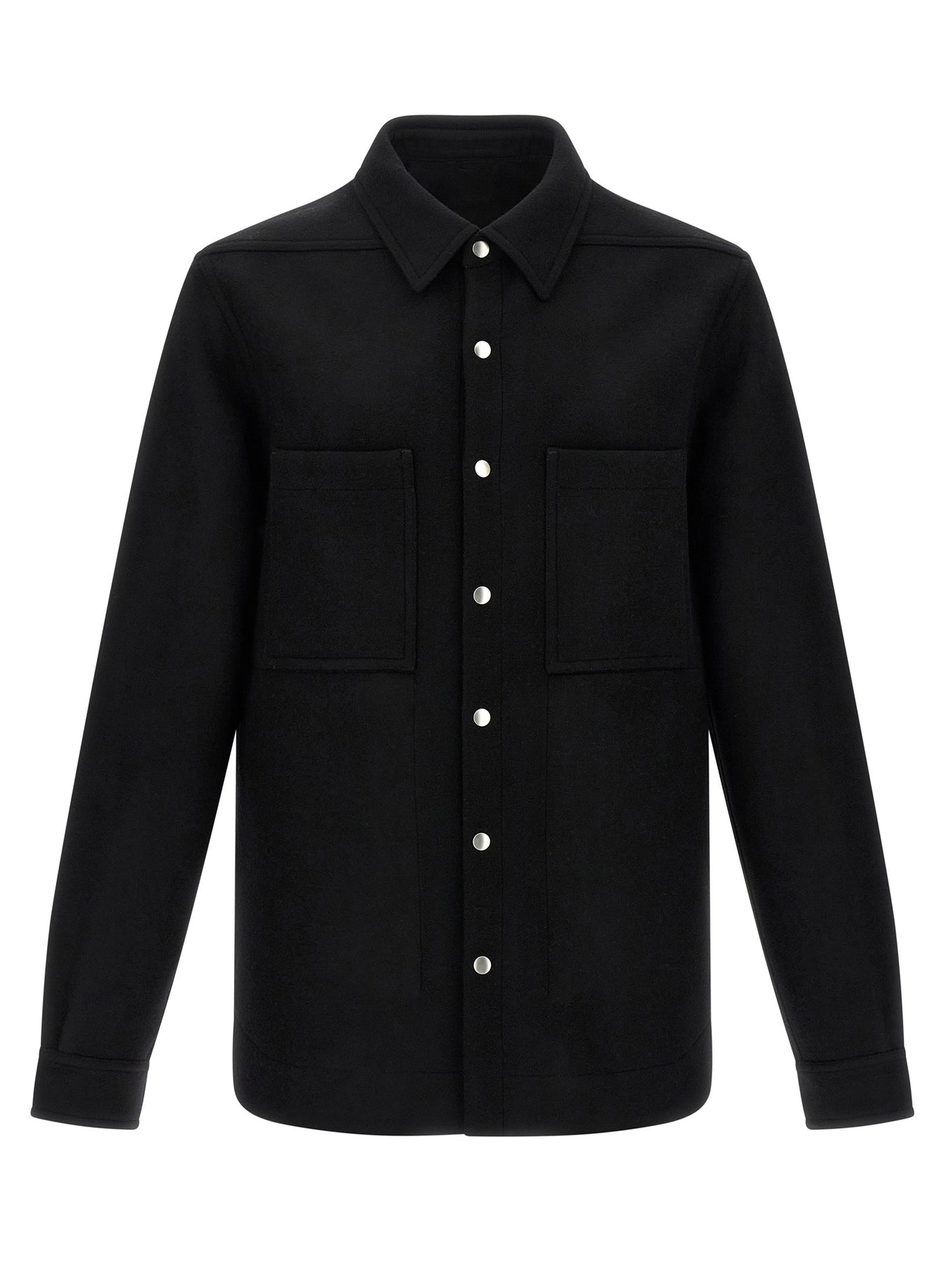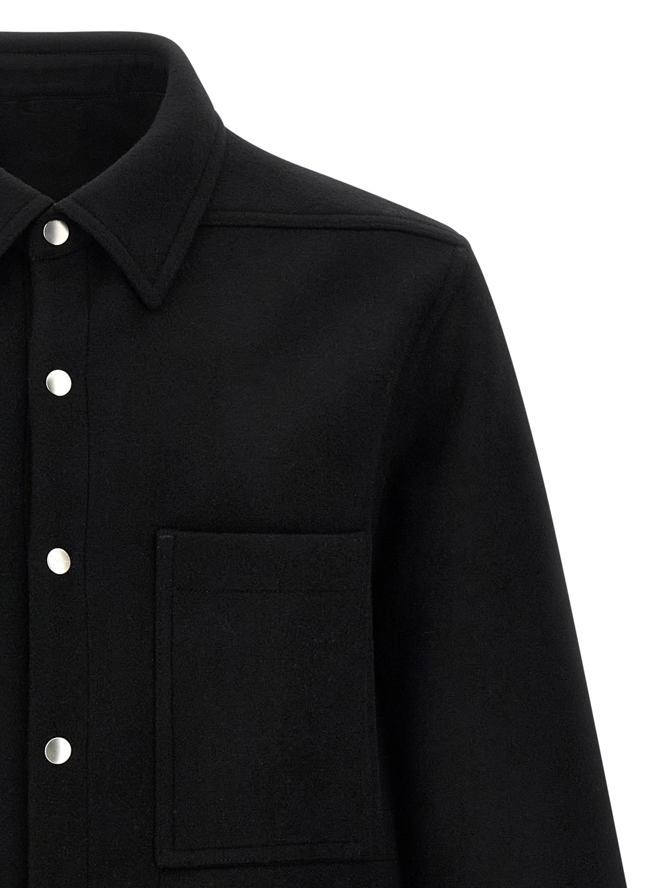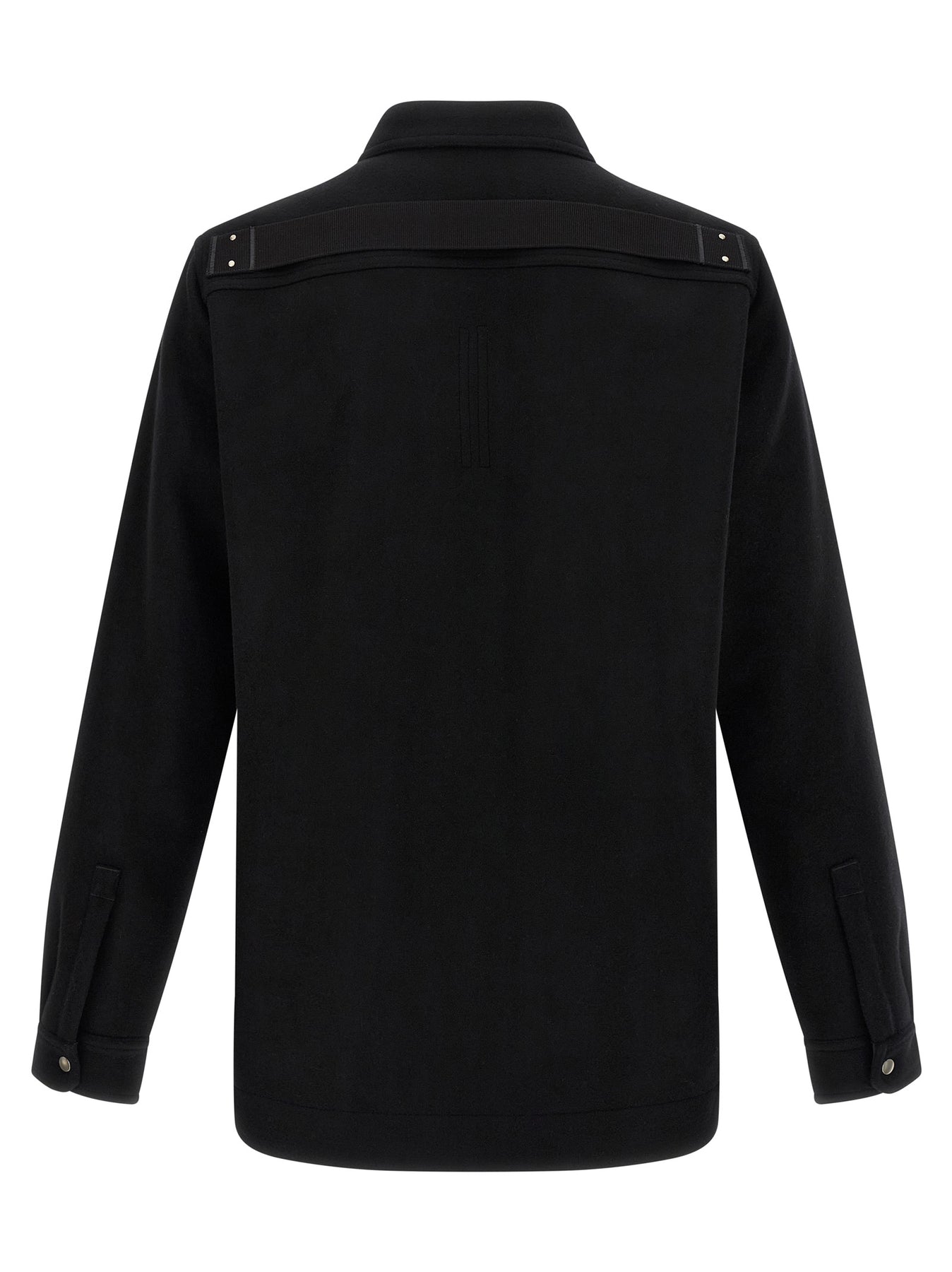 'Outershirt' wool cloth overshirt with front snap button closure, pockets, long cuffed sleeves, cotton strap with rivets on the back rack.