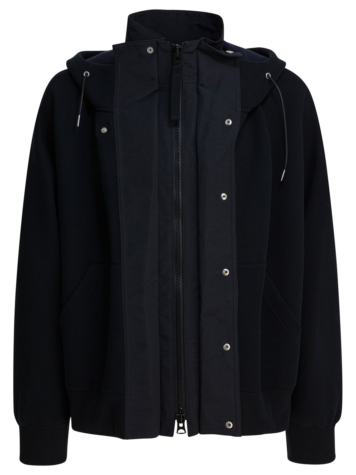 Sacai's "Sponge Sweat x Grosgrain" Utility Jacket, made of double-sided cotton-blend jersey, features a structured construction that integrates technical and tailored elements. The silhouette is outlined by a funnel neck and a central two-way zipper closure. Distinctive detail is the grosgrain trim applied to the zigzag flap with snap buttons. Patch pockets at the waist and ribbed finished edges complete the essential structure. || - Solid color - Long sleeves - Double-face cotton-blend jersey - Funnel neck - Two-way zipper closure - Grosgrain trim on flap with snap buttons - Patch pockets at waist - Ribbed hem and cuffs - Regular fit