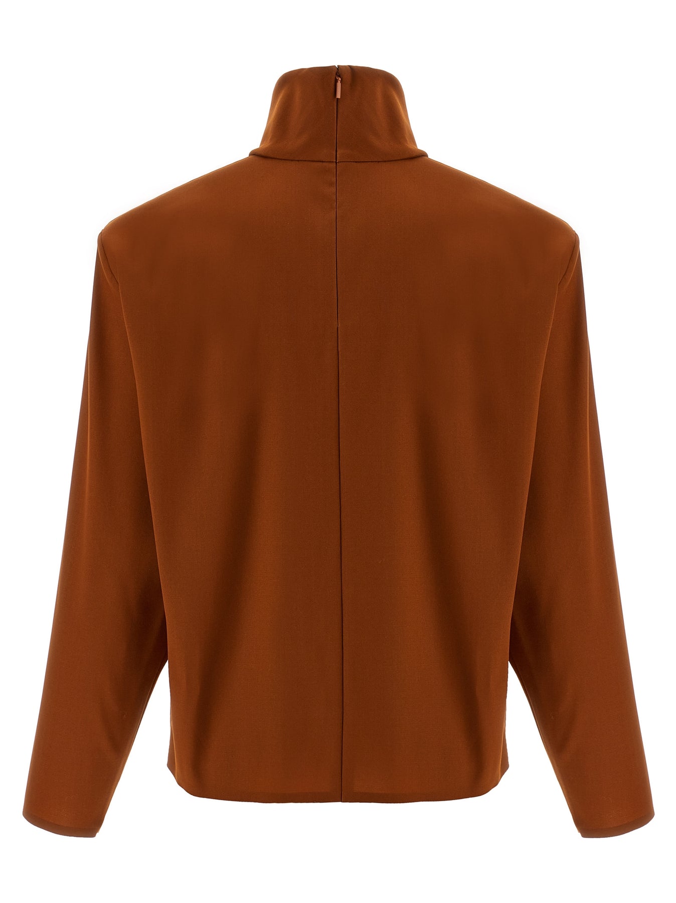 Stretch super organza sweater, high neck, structured shoulders with iron support, long sleeves, back zip closure.