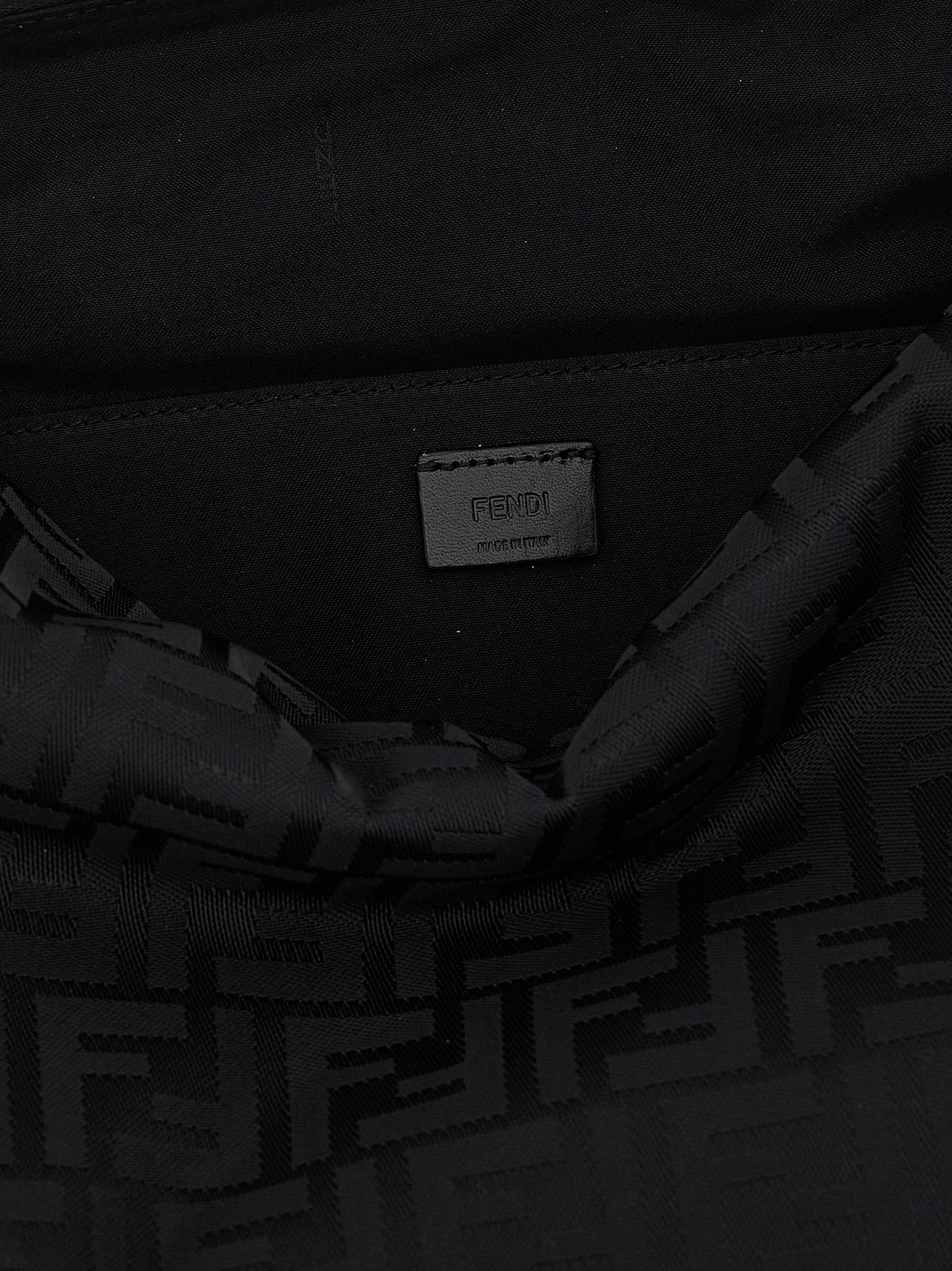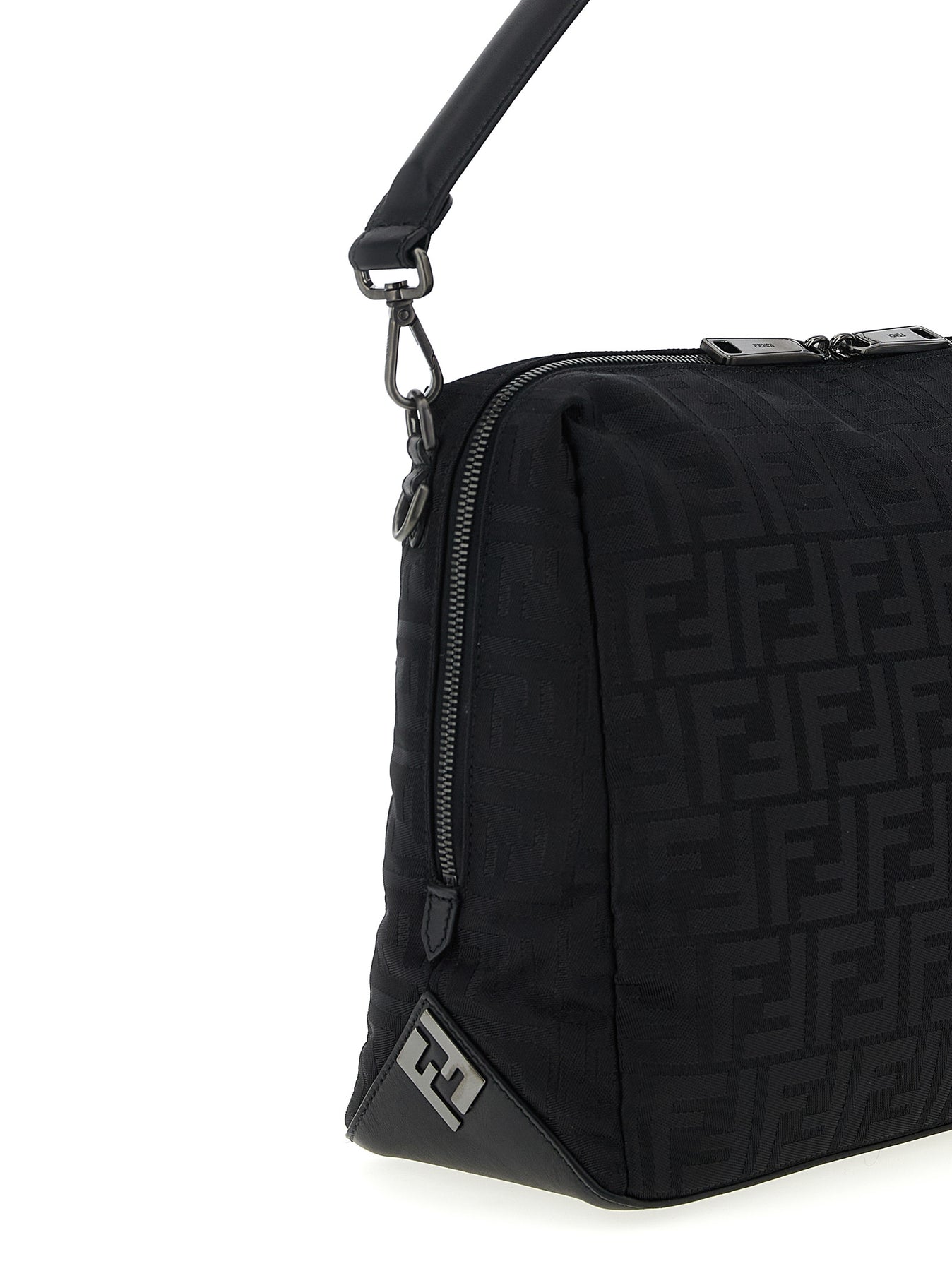 Fendi Lui' large shoulder bag in padded FF nylon with tone-on-tone smooth calf leather base and handle, metallic FF logo with satin ruthenium finish on the sides, top zip closure, removable handle, adjustable and removable tape shoulder strap.