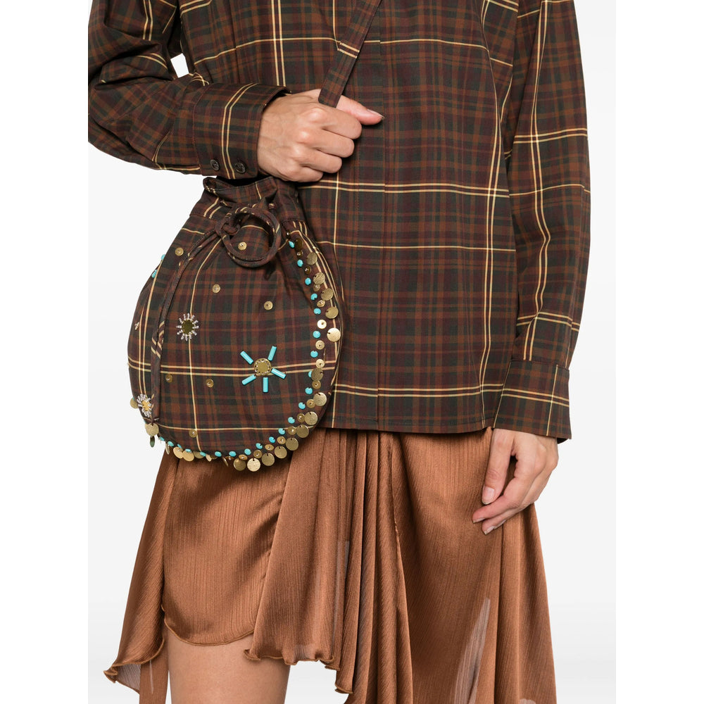 brown checked pattern long sleeves detachable crossbody pouch featuring ruffle trim and embellishments attached pocket coin embellishment