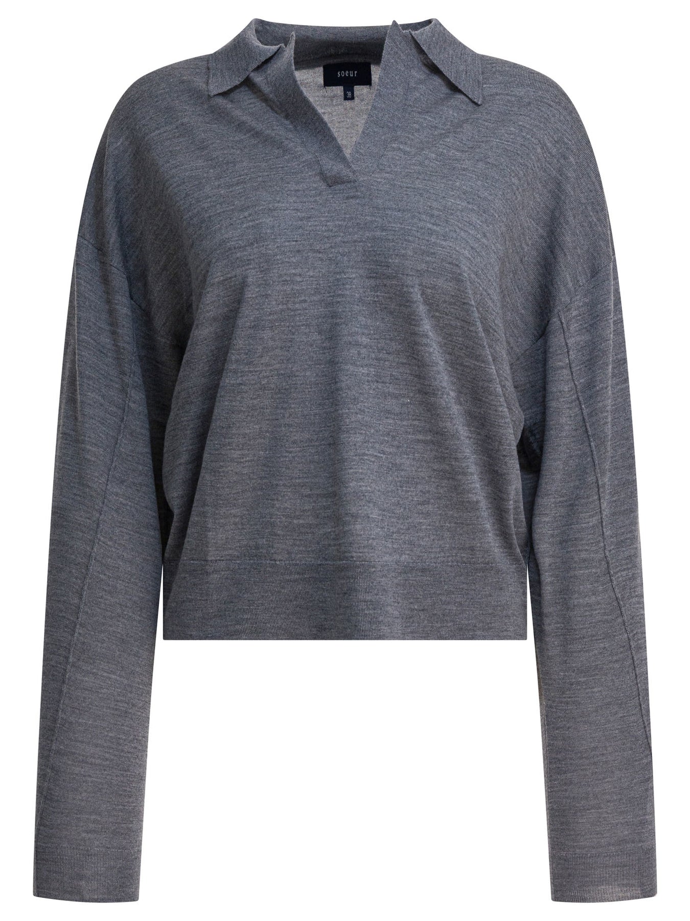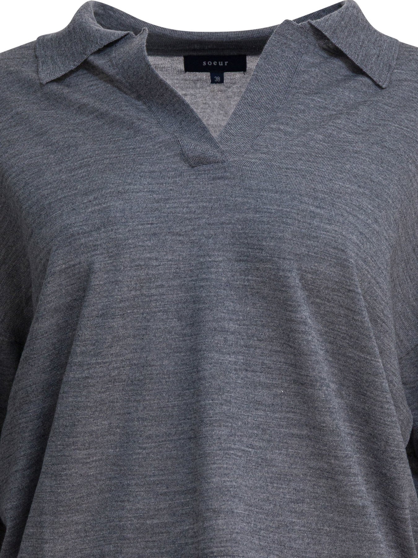 Soeur's "Fleming" sweater, constructed of fine-gauge merino wool, features an oversize silhouette with a straight fit. The construction features long sleeves and a polo collar. The lines are essential and the fine workmanship emphasizes the compactness of the fabric, ensuring a lightweight yet structured knit. No superfluous details interrupt the surface, enhancing the regularity of the knit. || - Solid color - Long sleeves - Polo collar - Fine thickness - Merino wool - Regular fit