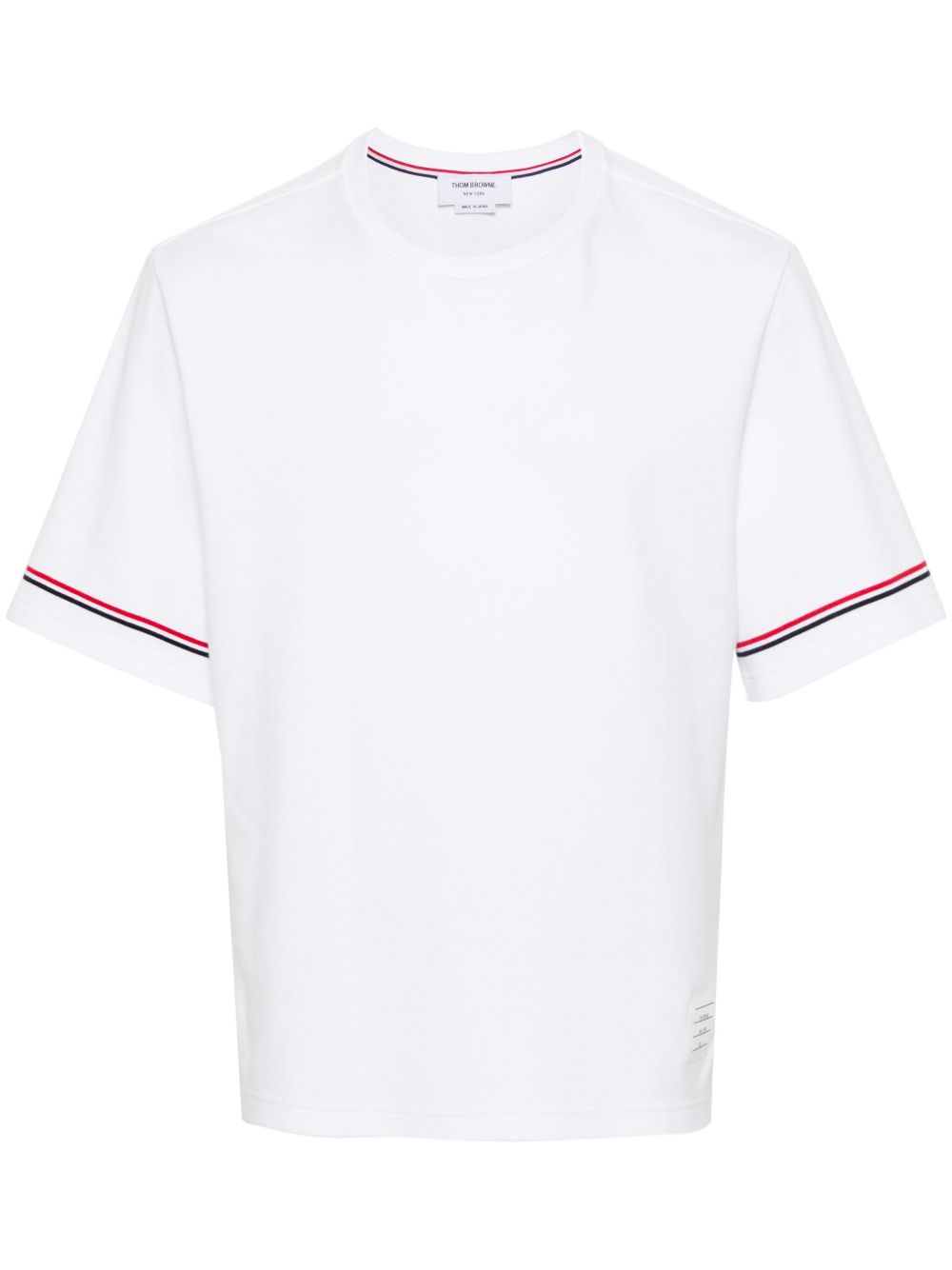 red/white/blue cotton jersey texture RWB stripe ribbed crew neck short sleeves short side slits logo tag signature grosgrain side tabs signature grosgrain loop tab high-low hem
