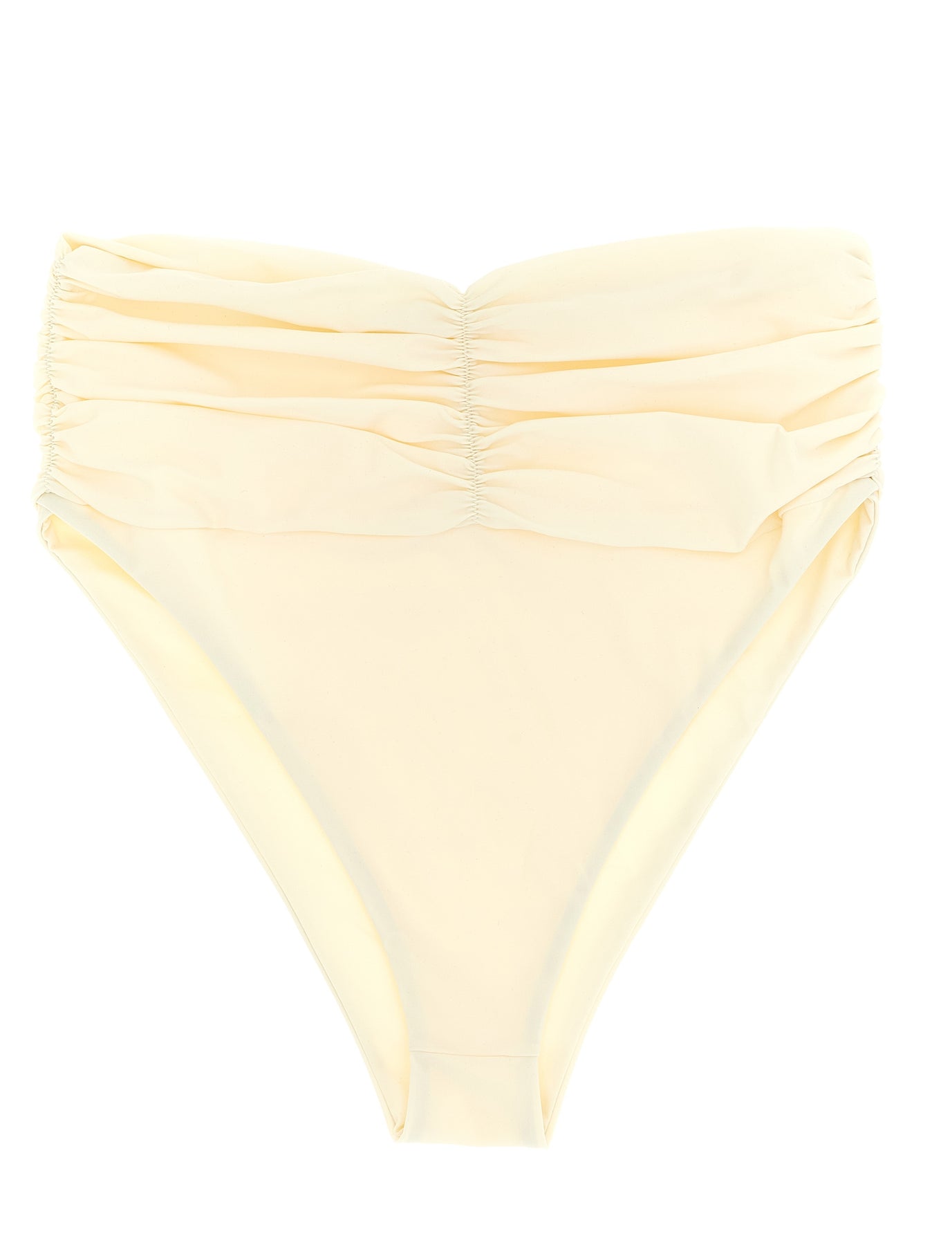 'PF21' bikini bottoms with high waist style with side ruffles, removable floral appliqué with clip.