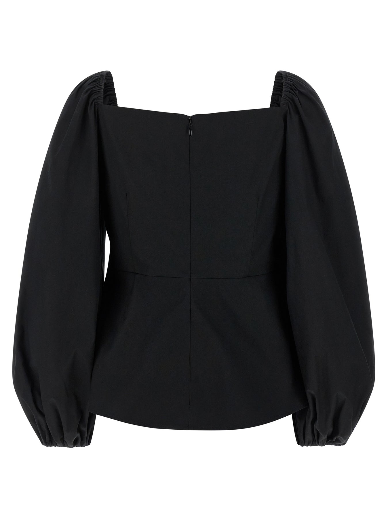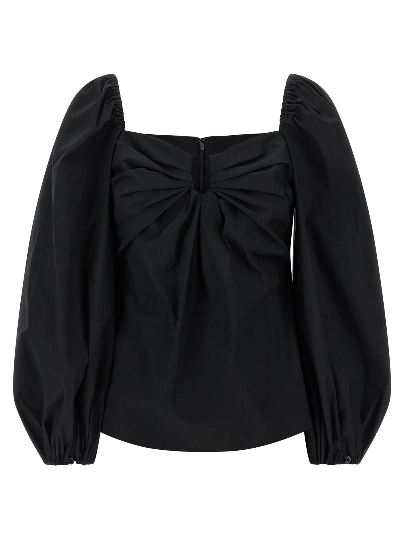 Cotton poplin top with puff sleeves, round underwire neckline and ripple in the center, back zip and hook closure.