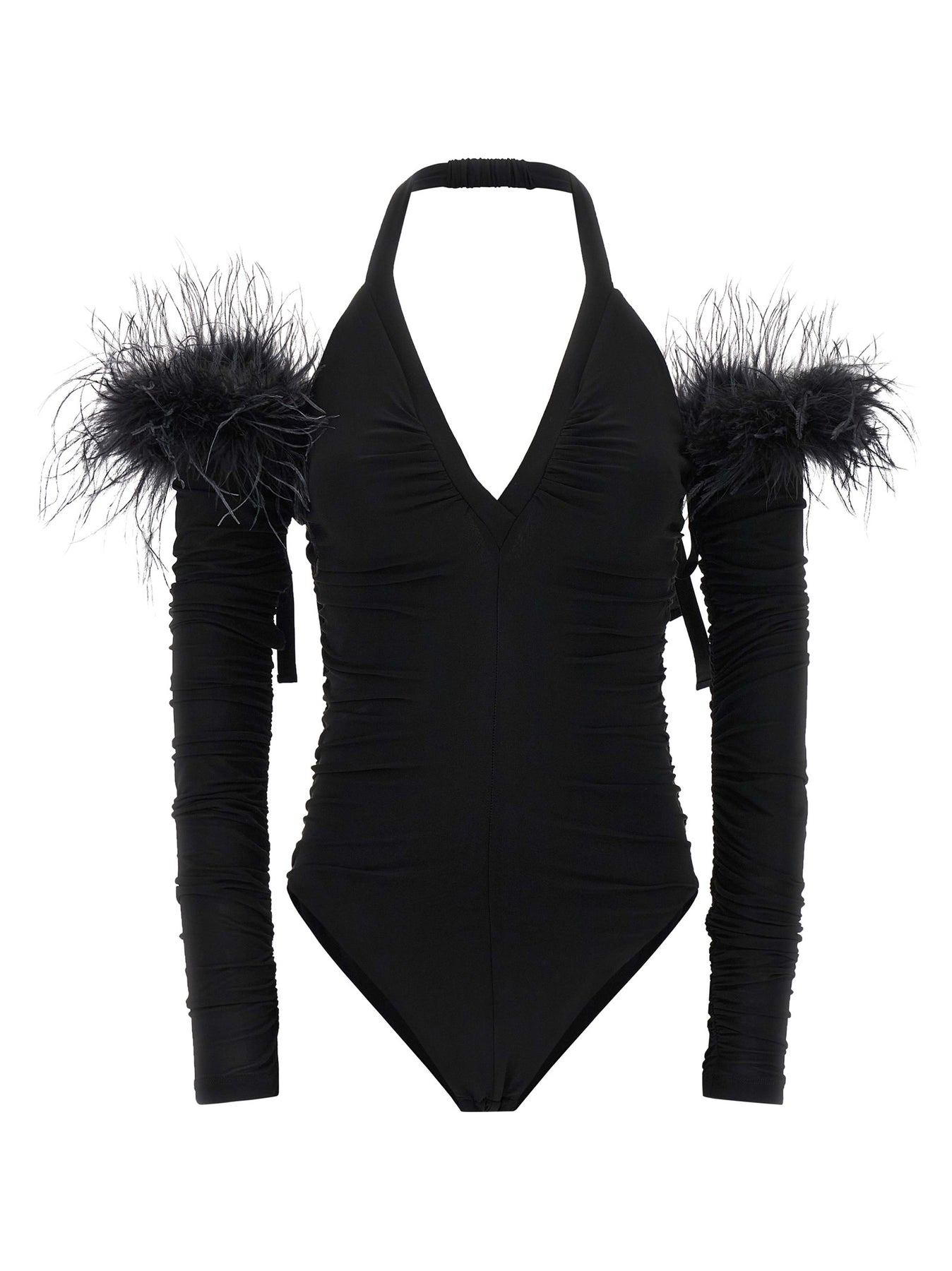 'Ottovolante' bodysuit in light jersey fabric, draping and curling at the front and back, shoulders with feather application mounted on a grosgrain ribbon and removable long sleeves, deep V-neck, drawstring behind the neck, bare back, snap buttons on the hem.