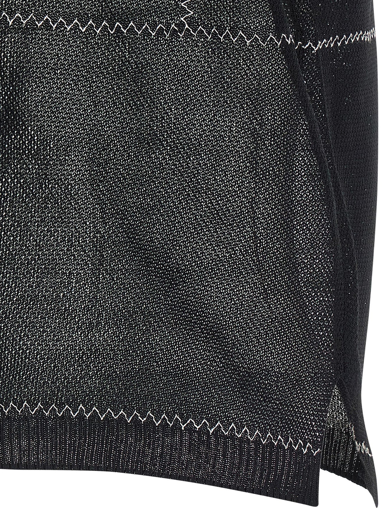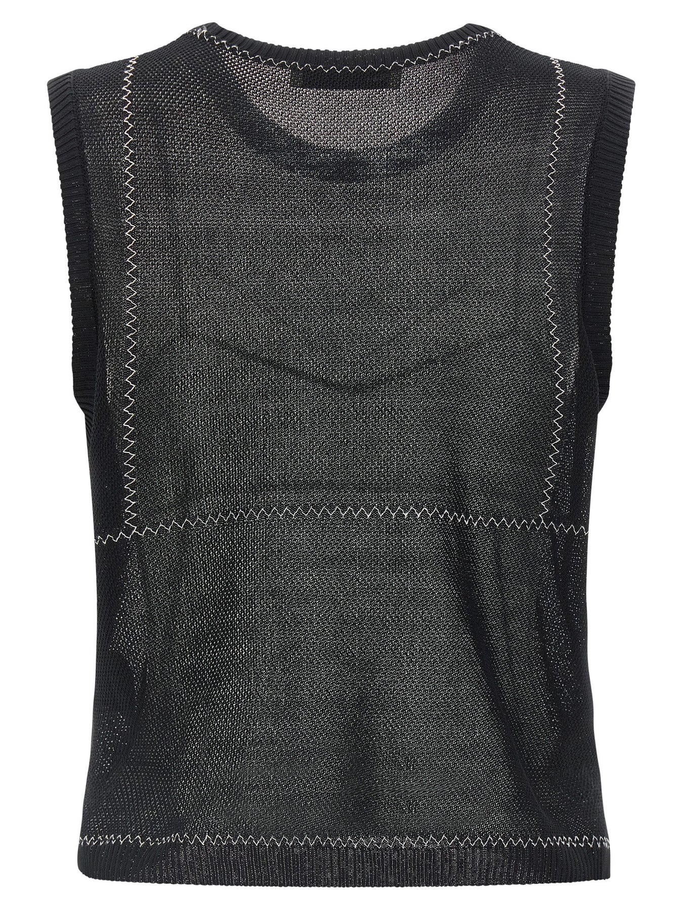 Semi-transparent mesh top, crew neck, sleeveless, contrast 'zig-zag' stitching detail.