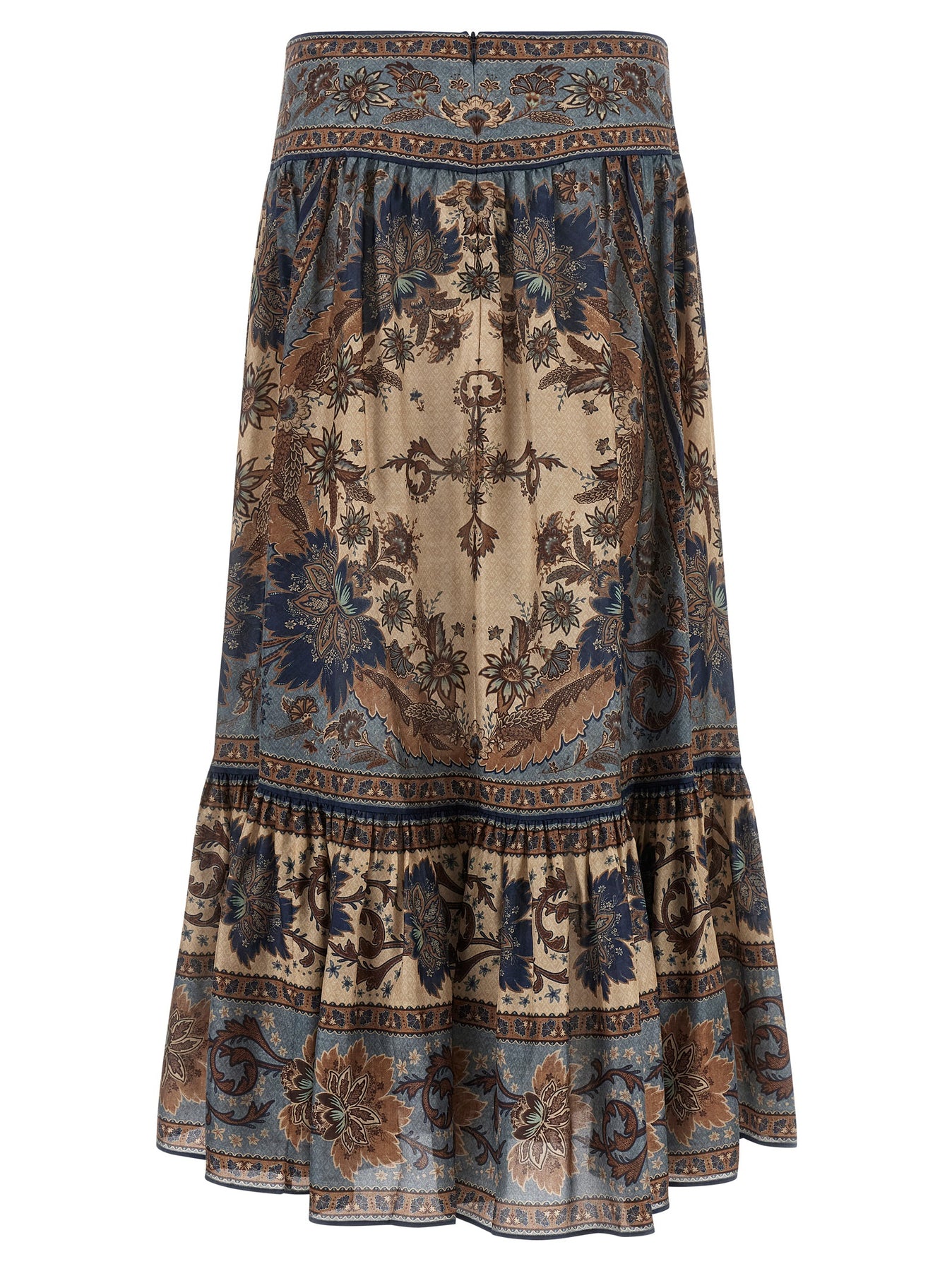 'Ascension' midi skirt in habutae silk with 'Indienne Floral' pattern, wheel model, medium waist with curls, back zip closure, flounce on the hem.