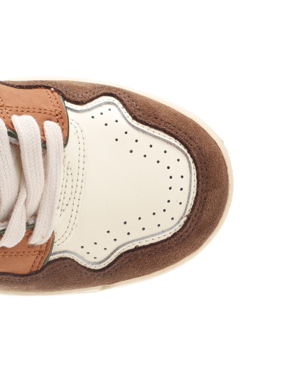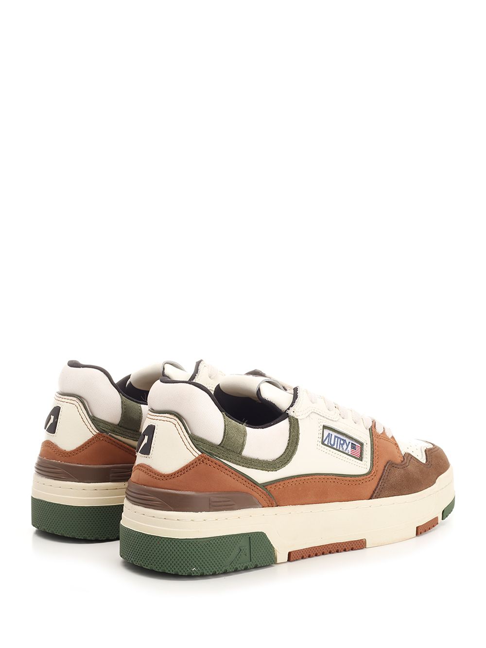 White leather with multicolor suede details "CLC Low" sneakers by Autry, rubber sole with green and brown inserts, side fabric logo and white lace-up closure.