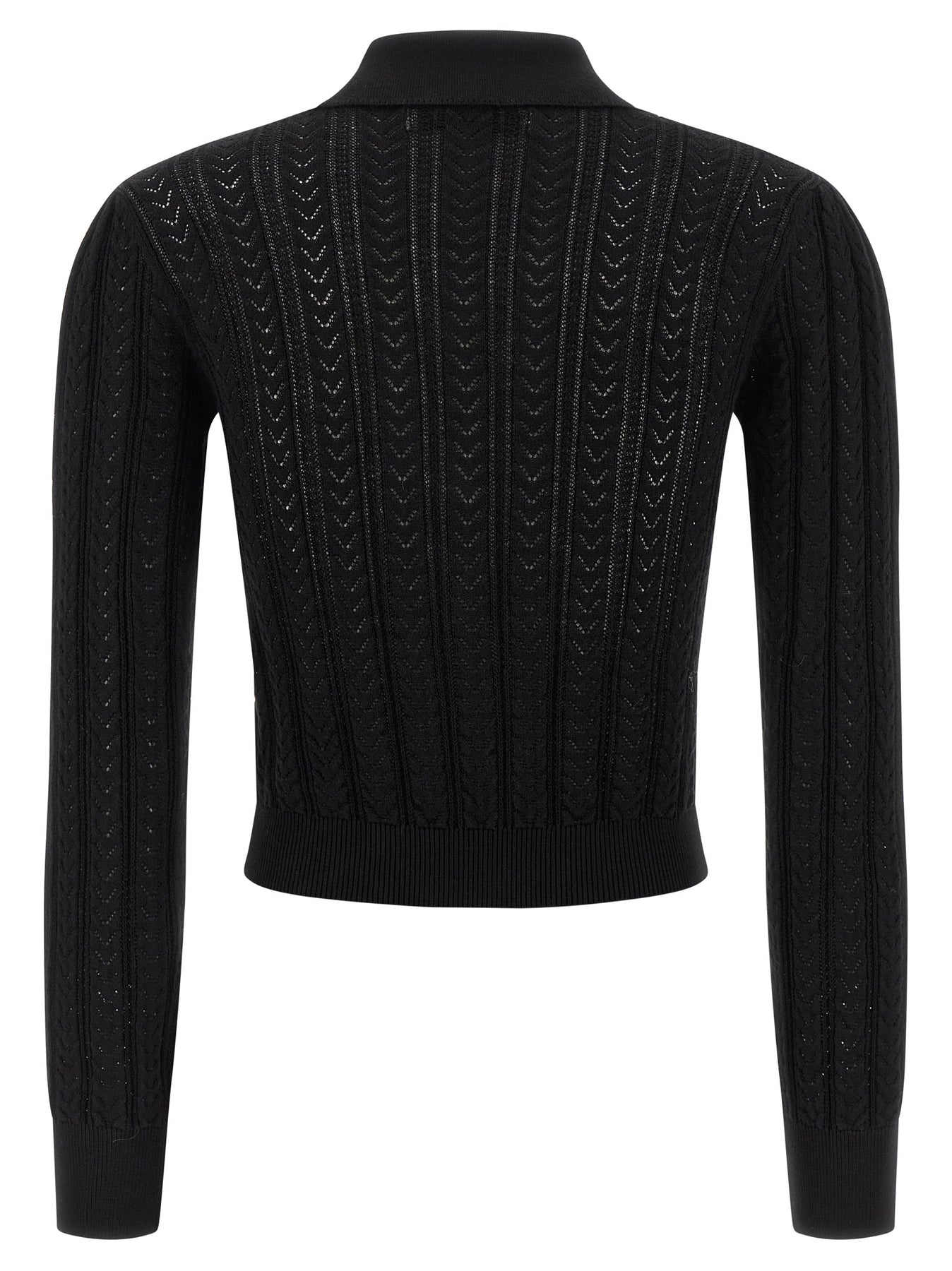 Cashmere blend knit cardigan, openwork, V-neck with lapels, pocket detail, front closure with jewel buttons.