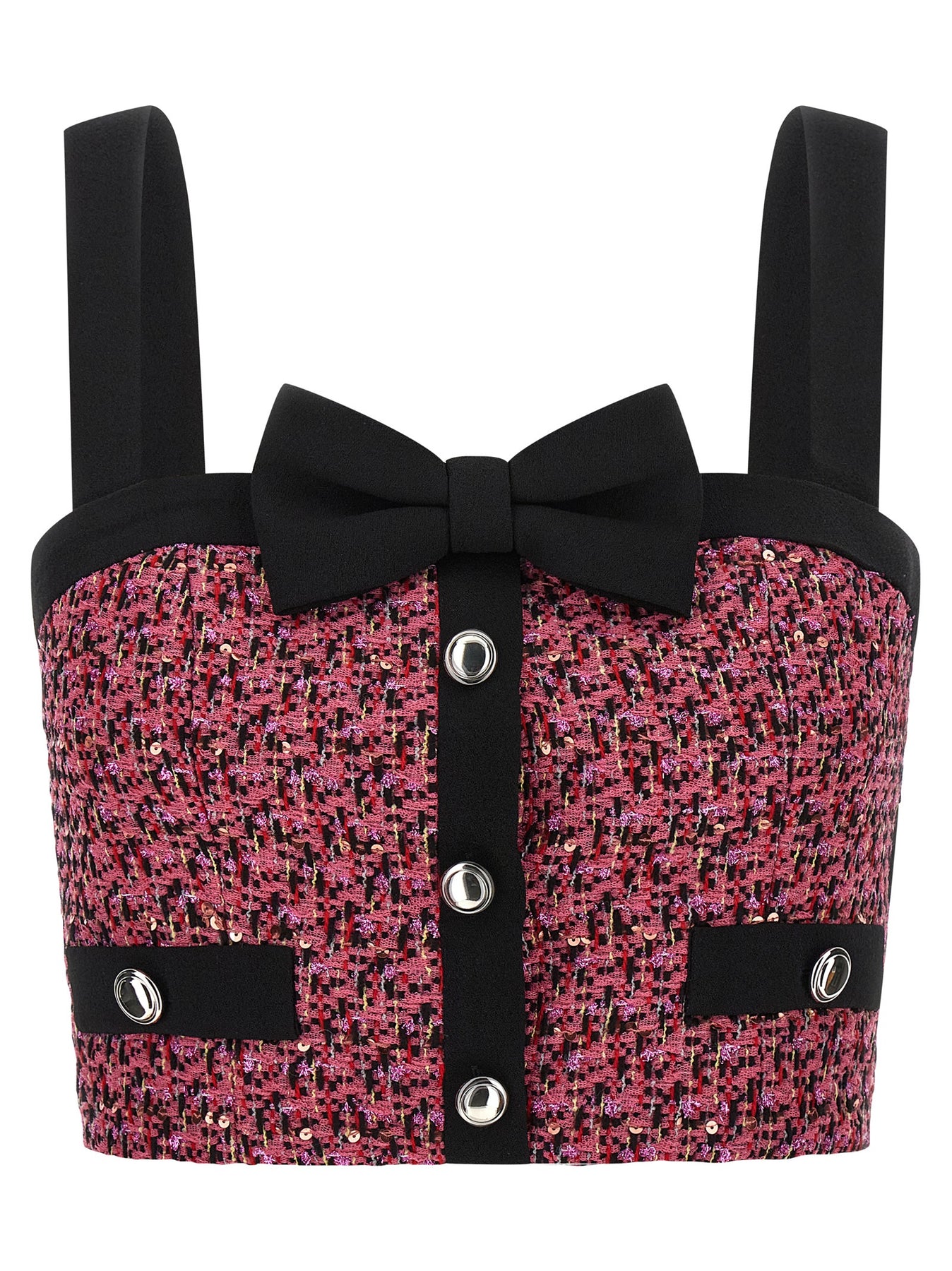 Wool blend tweed top with all-over micro-sequin embroidery, front metal buttons and bow detail, and shoulder straps.