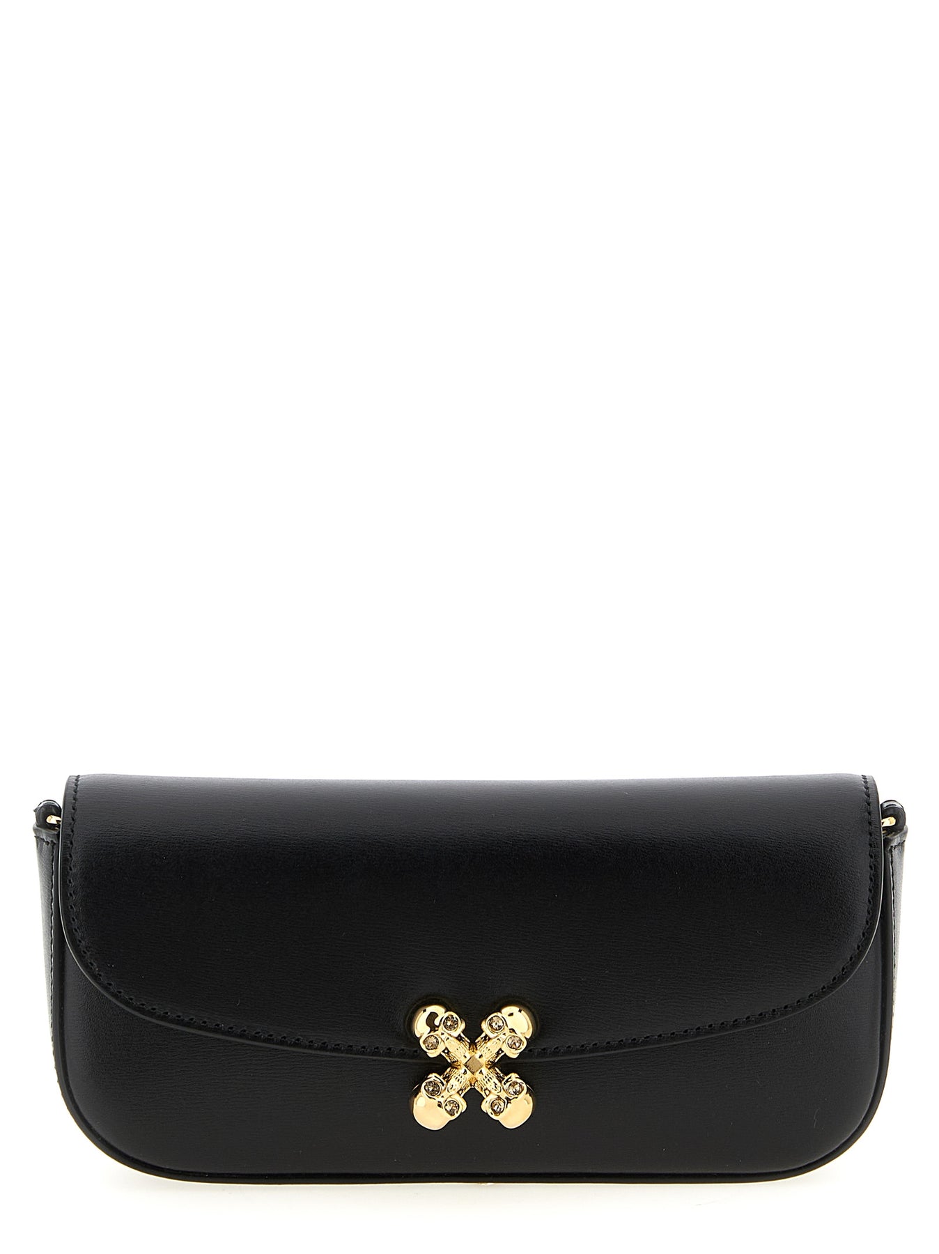 Small crossbody bag in calf leather, elongated East West silhouette, magnetic flap closure with jewel 'Skull Flower' detail on the front, chain shoulder strap with leather protection.