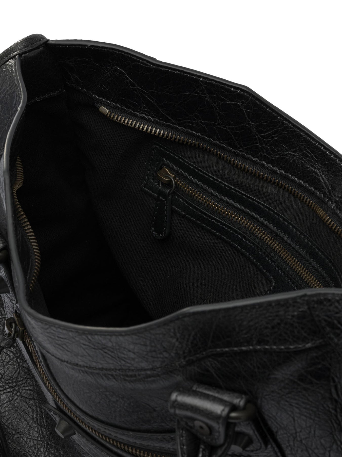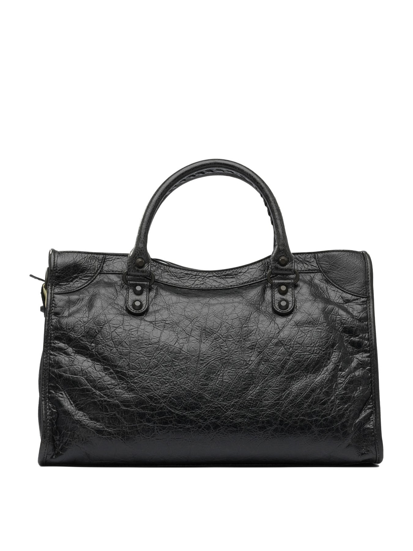 Balenciaga "Le City" handbag, constructed of Arena Storico lambskin leather with a visible grained surface. The flexible structure features two hand-woven leather handles and an adjustable, removable shoulder strap. The silhouette features a top closure with a zipper and knotted leather pull, functional details evident on the main body and front zippered pocket. The interior includes a cotton canvas lining. || - Lambskin leather - Two hand-braided handles - Adjustable and removable shoulder strap - Top closure with zipper and knotted leather puller - Front pocket with zipper and knotted leather puller - One interior zippered pocket - Inner cotton canvas lining