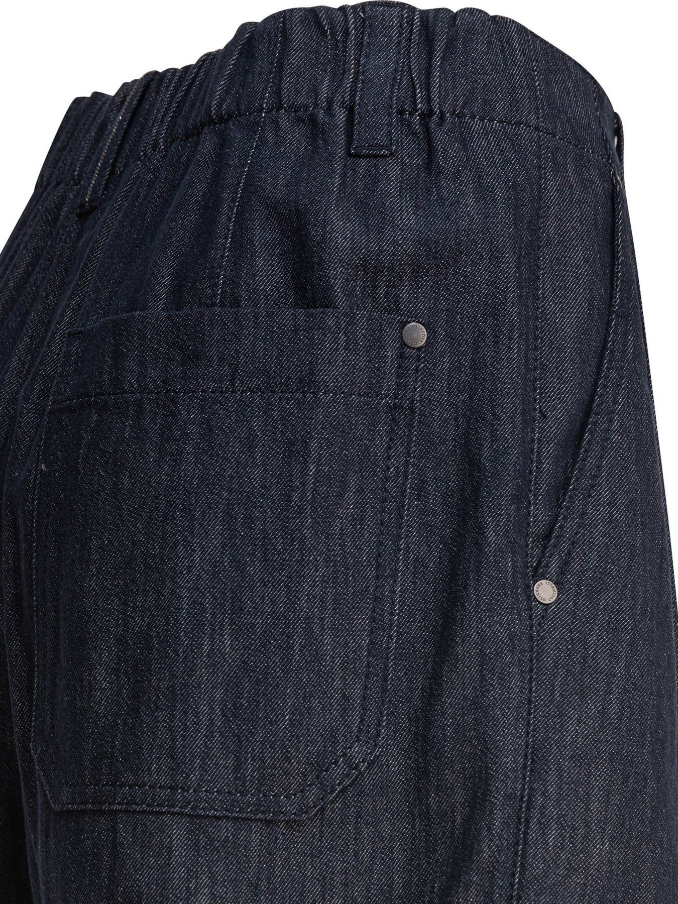 Brunello Cucinelli "Baggy" short in denim-effect twill, made of pure cotton with a compact and lightweight weave. The soft structure is defined by a wide silhouette, enriched with double front dart. The closure consists of zipper, metal hooks and counter-button. There are back elastic band, front and back pockets. Nickel-free jewel decorative element placed on the garment. || - Denim-effect twill - 100% cotton - Double front darts - Zipper closure with metal hooks and counter button - Back elastic band - Front pockets - Back pockets - Nickel-free jewel decoration - Relaxed fit