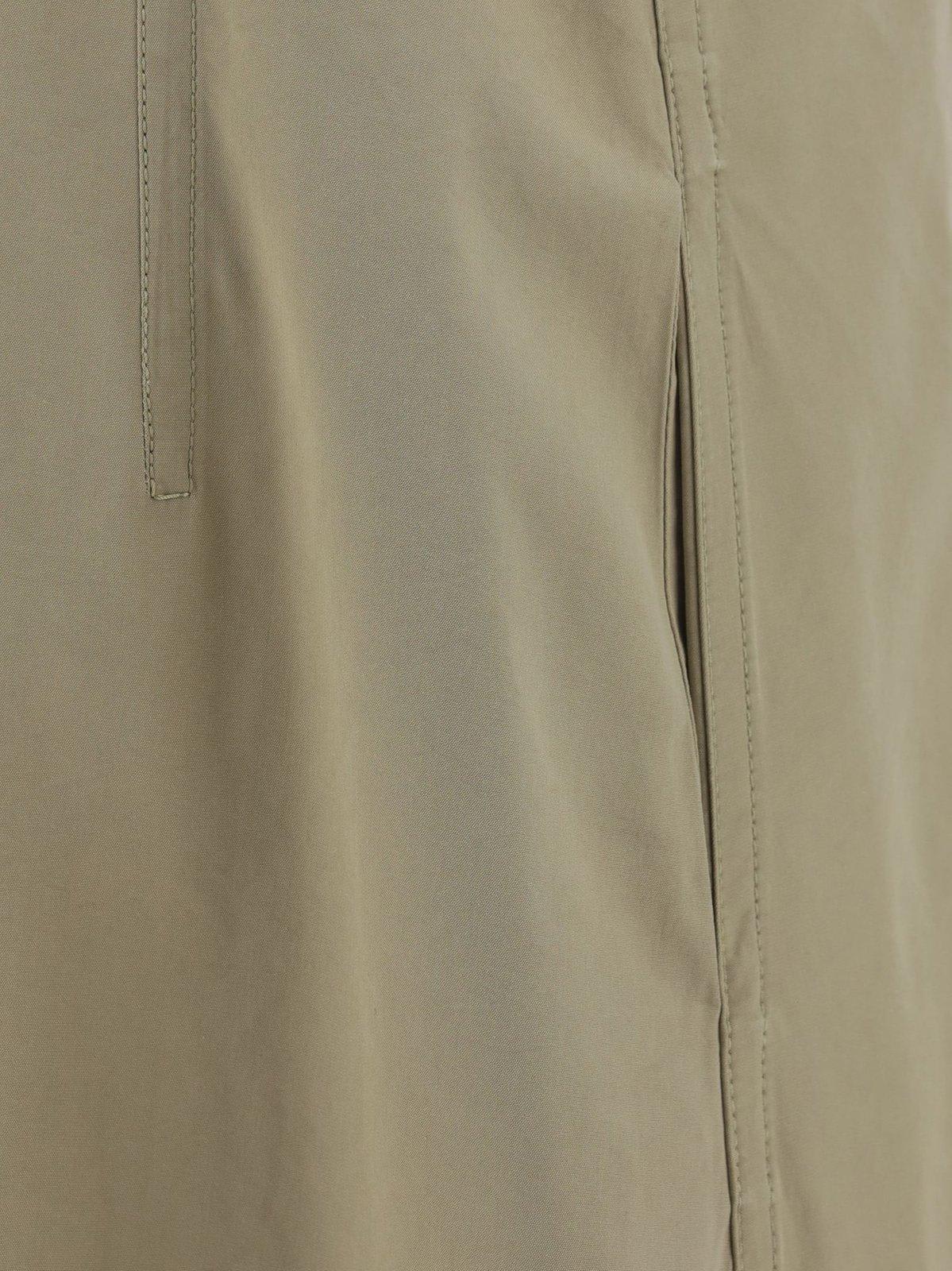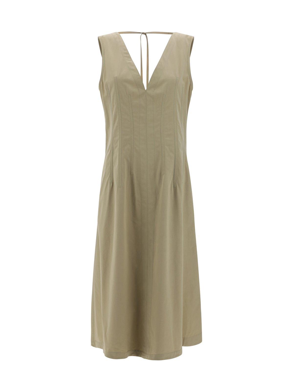 Beige maxi dress from Bottega Veneta in cotton, sleeveless, deep V-neck on front and back, neck fastening with drawstring.
