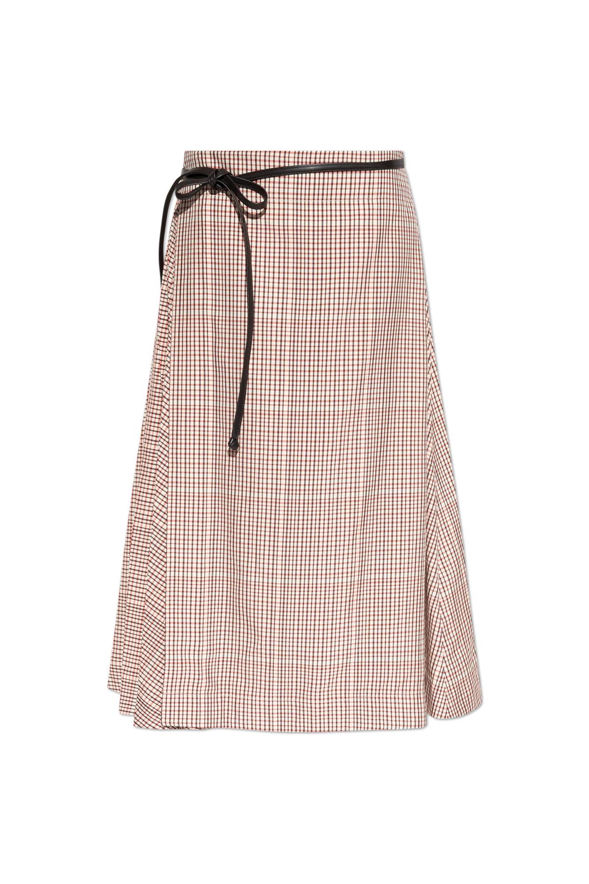 Midi skirt by Bottega Veneta with a checked pattern in pearl, black and scarlet red. Crafted from a viscose blend and featuring a leather belt at the waist.