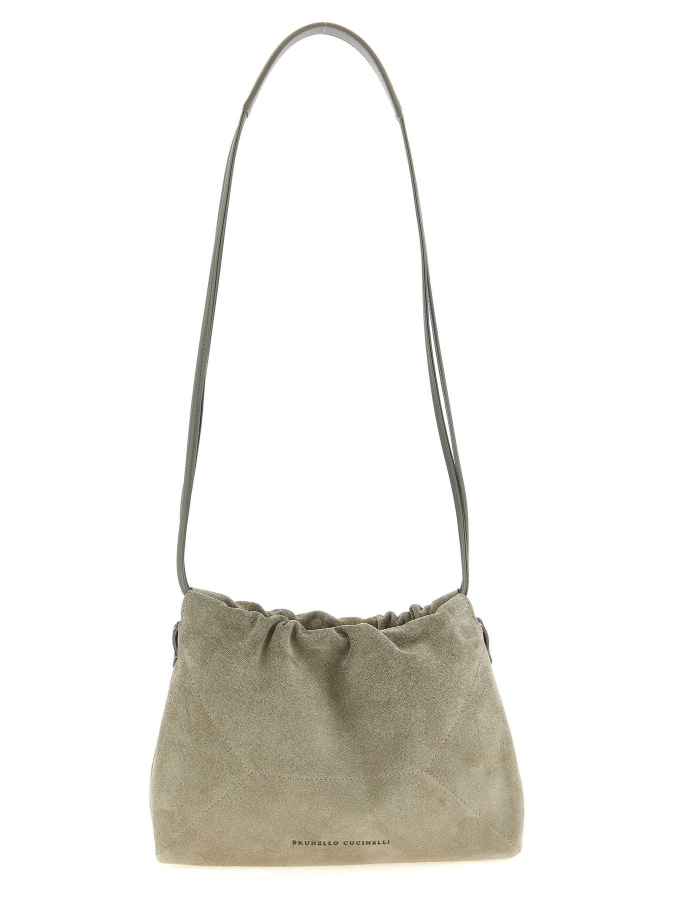'BC Duo' suede pouch with panel construction, front embossed logo, side jewel details, drawstring closure directly connected to the leather shoulder strap.