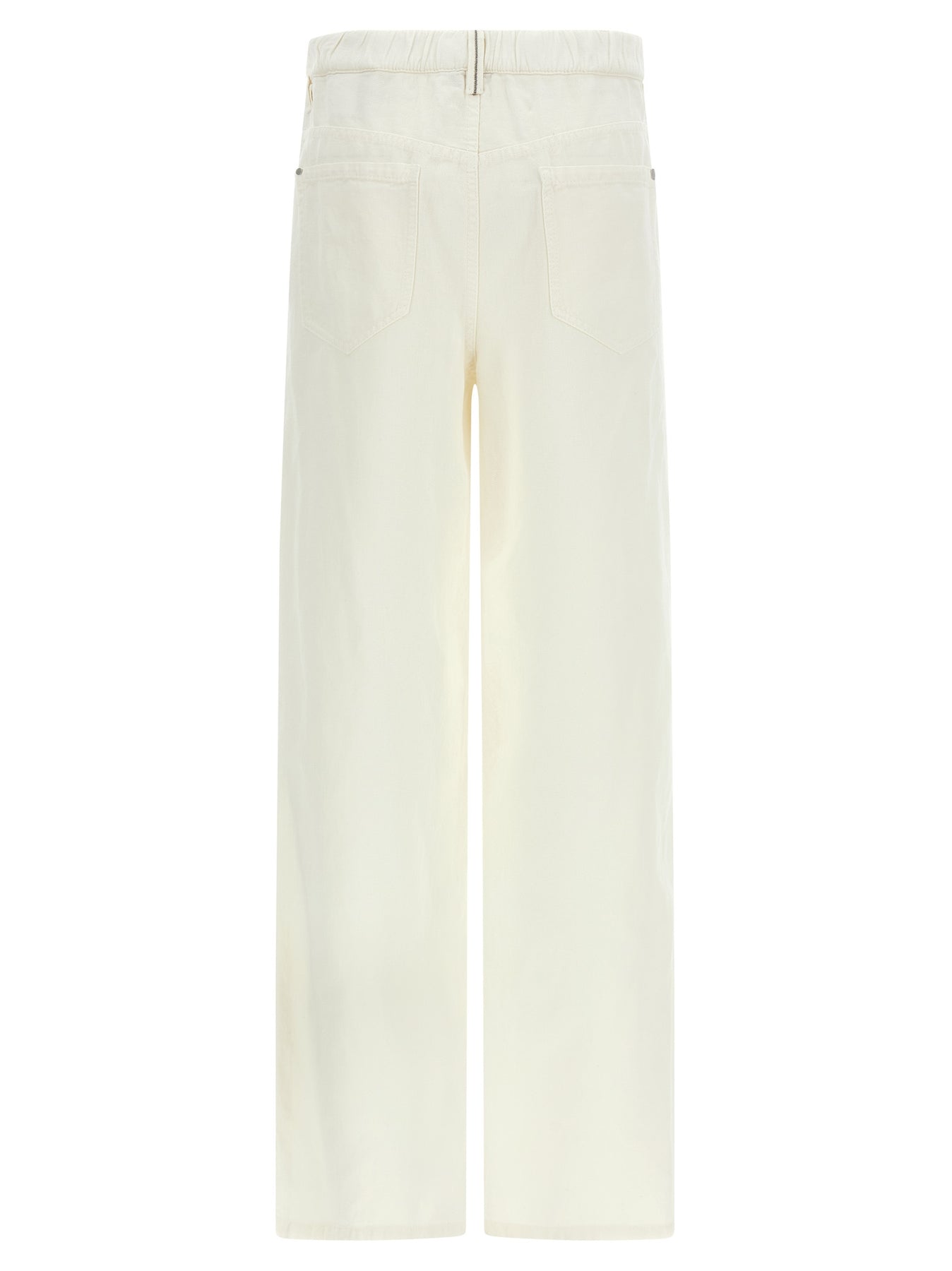 Linen blend cotton trousers, 5-pocket model with elastic waistband, loops with Monile detail, slightly wide straight leg.