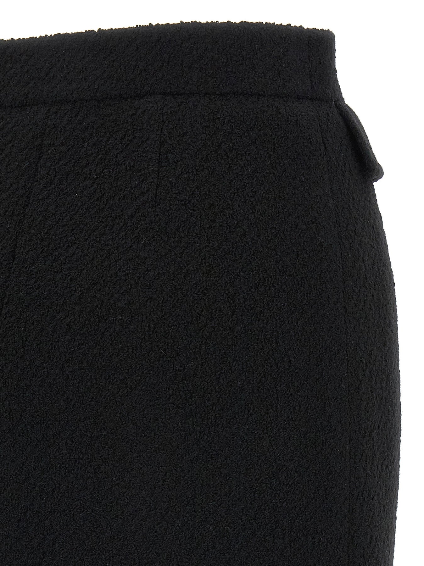 Midi skirt in bouclé wool, silk lining, trompe l'oeil pockets, side zip closure.