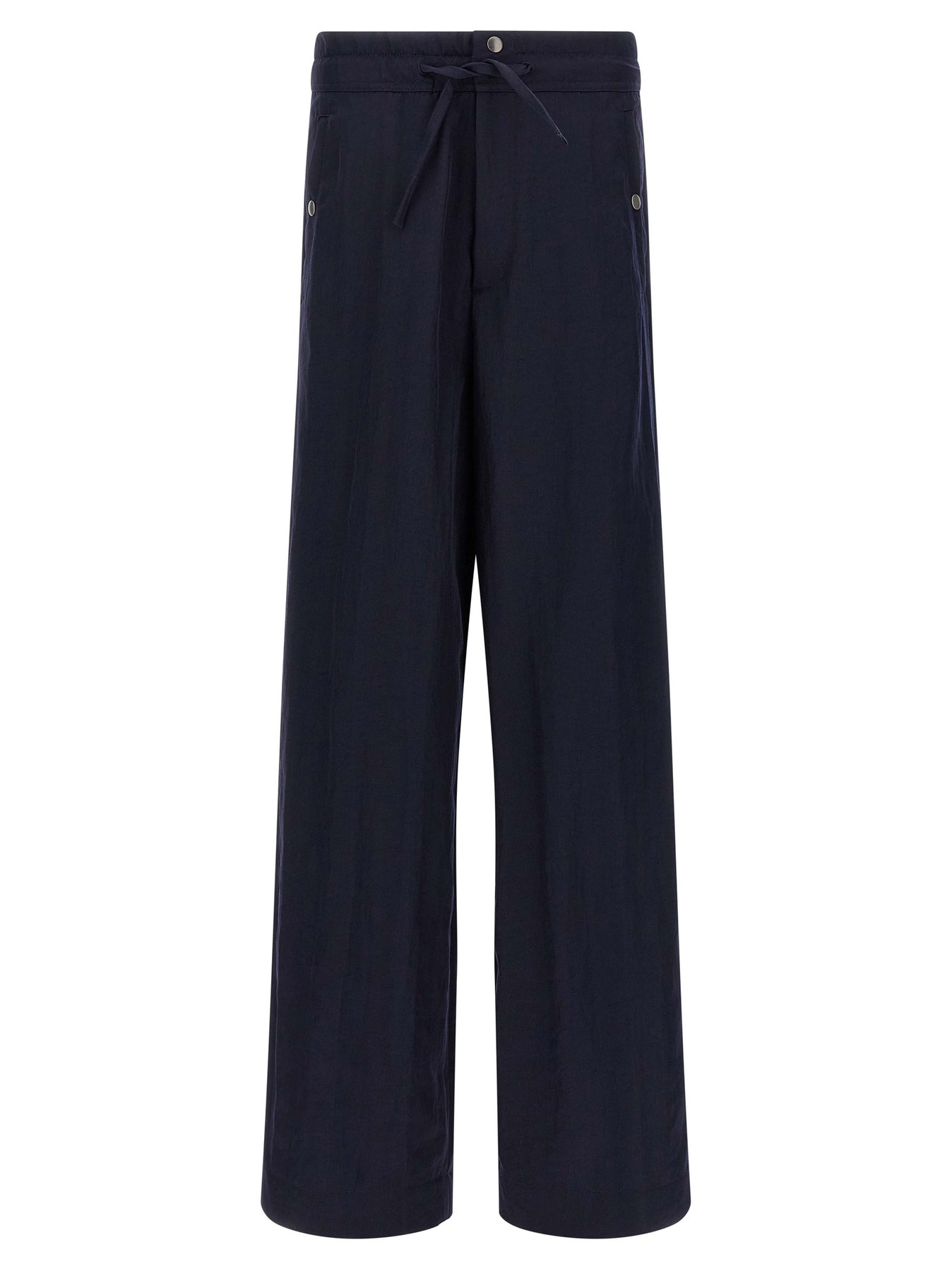 'Prima' water-repellent nylon pants, wide and straight leg, adjustable elastic and drawstring at the waist, zip and snap button closure on the front, pockets.