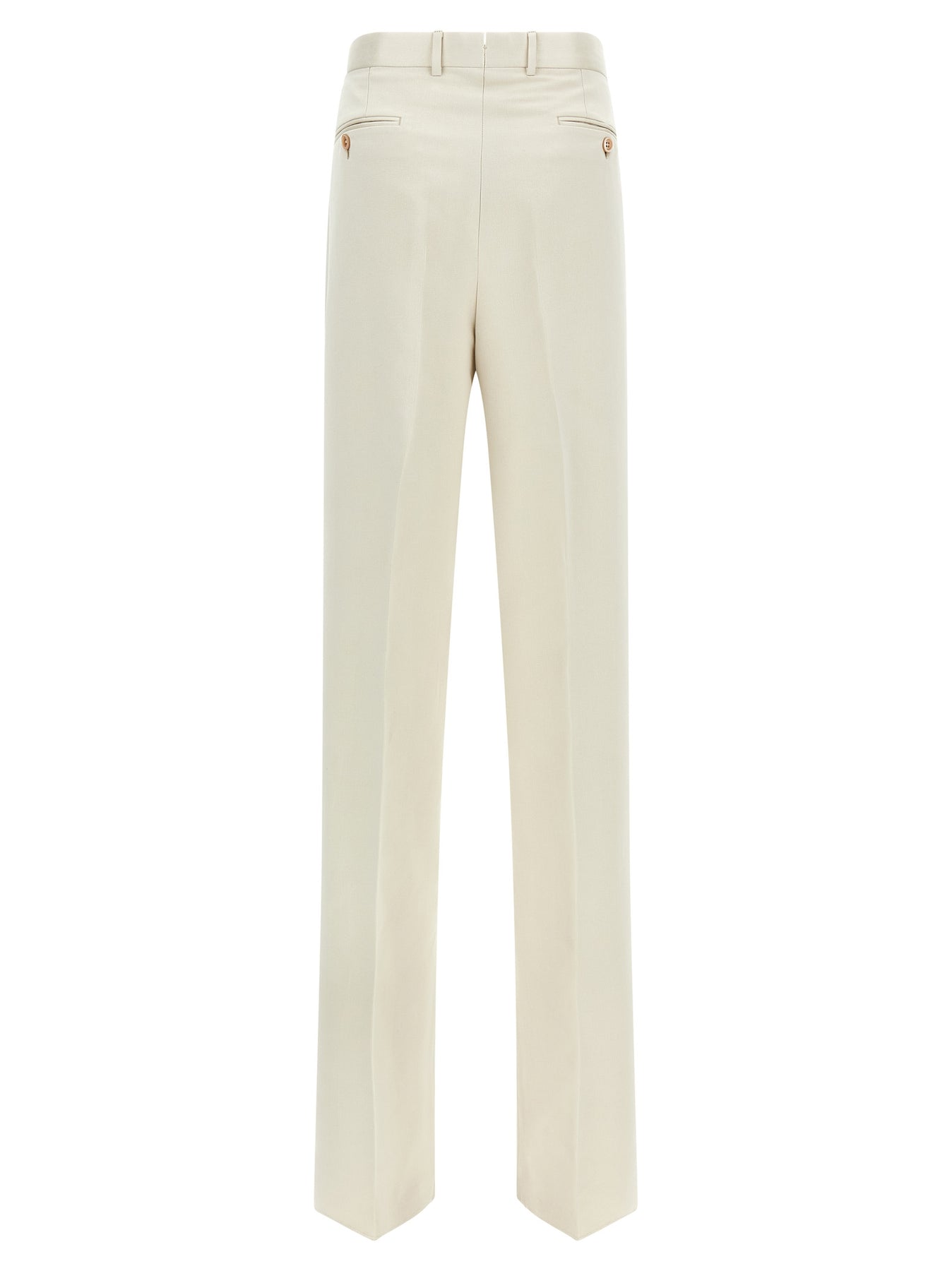Cotton and silk trousers, double pinch and zip hook and front button closure, iron pleat, straight leg.