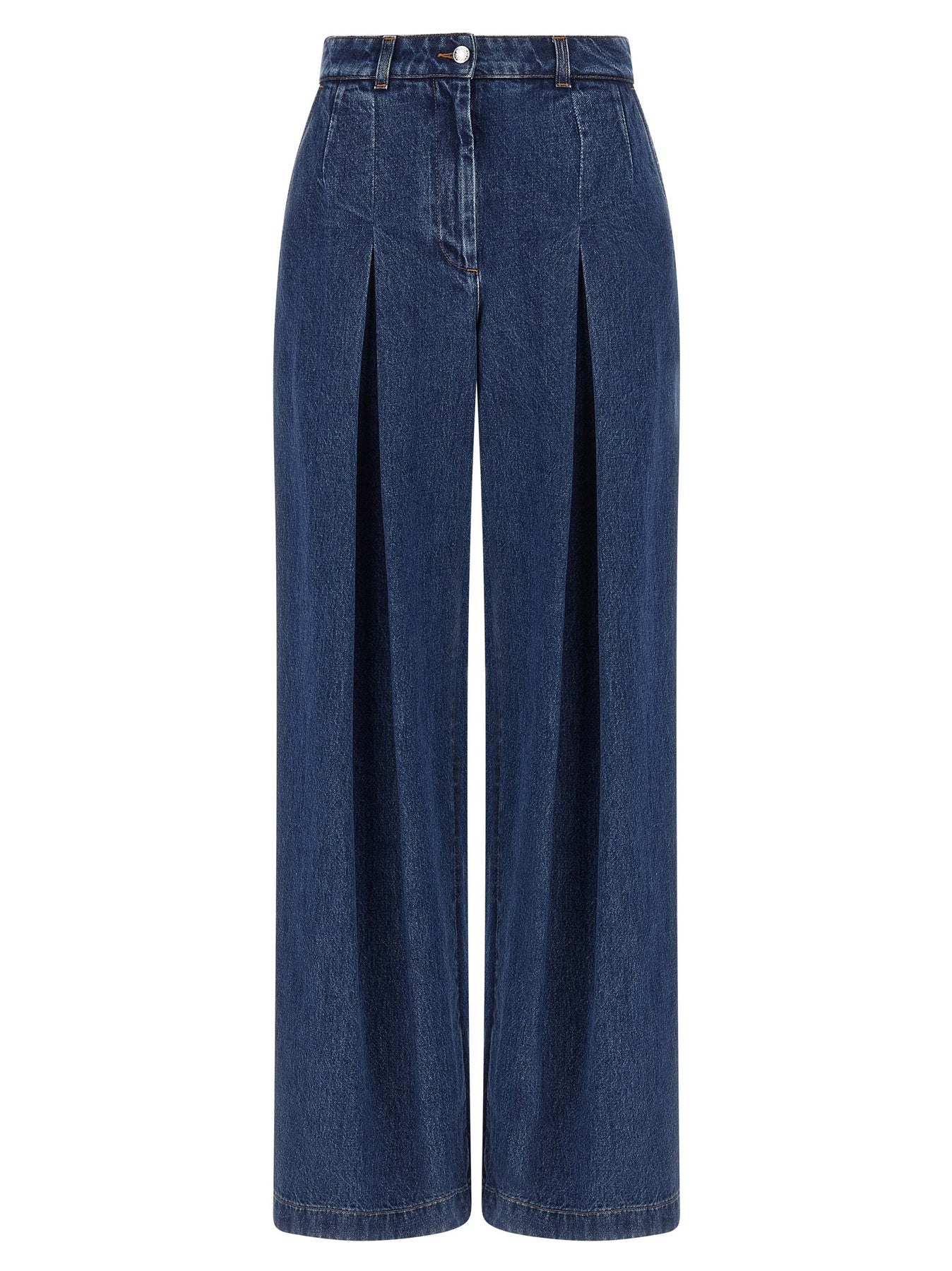 Cotton denim jeans with contrast stitching, Dolce waist, wide leg with front pinch and gussets, zip and button closure, five pockets.