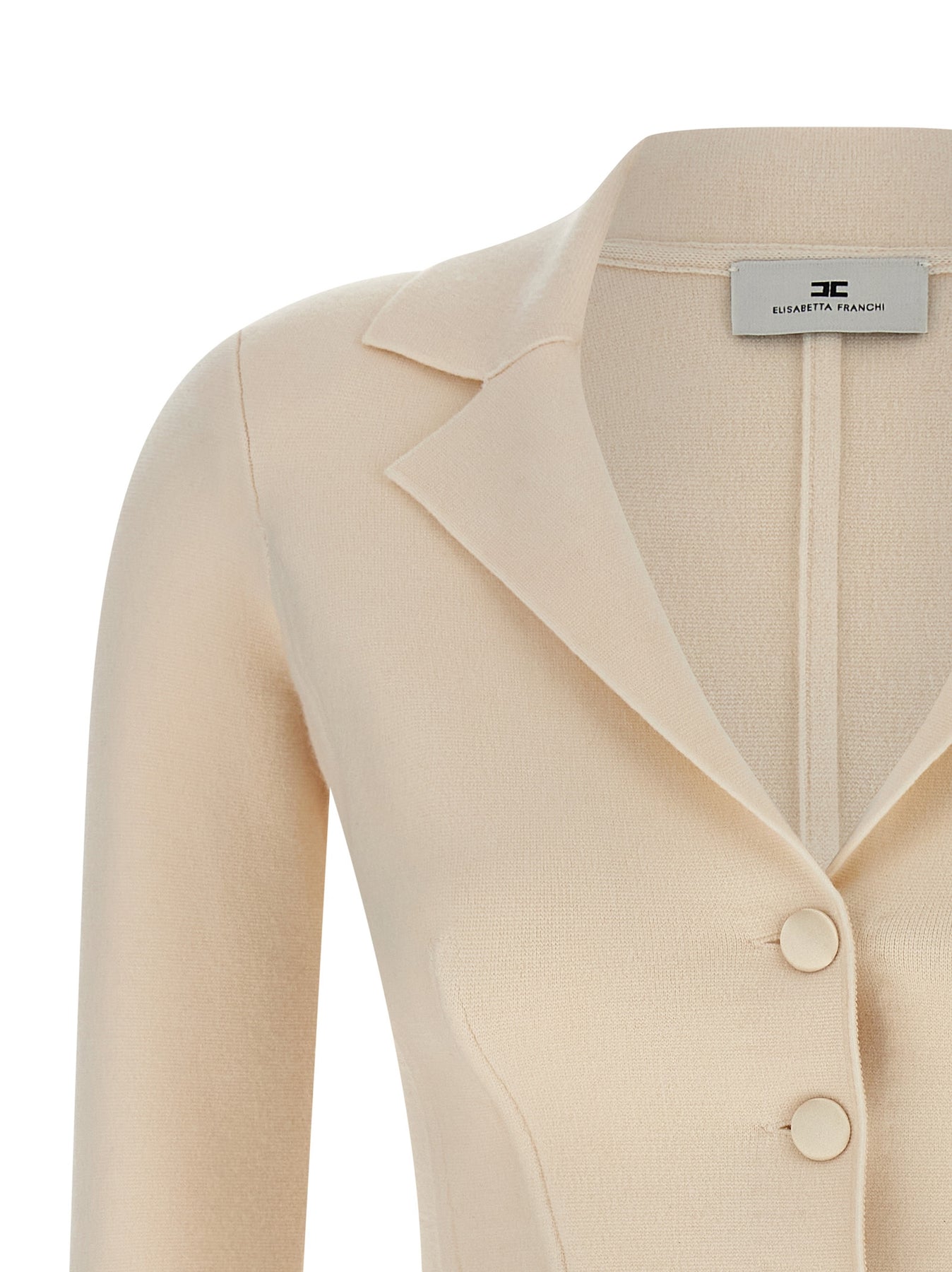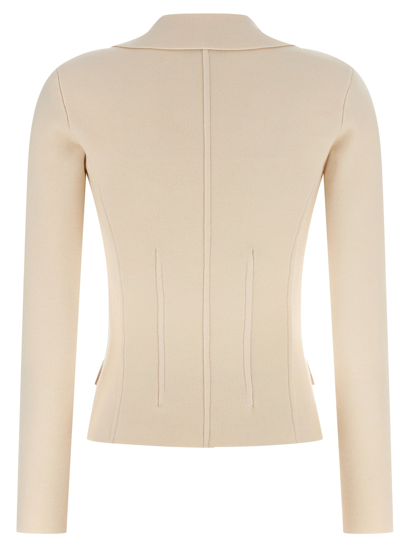 Single-breasted blazer in wool with hourglass silhouette with corsetry-inspired ribs, button closure and front V-neck, mirror lapels, flap pockets with tone-on-tone embroidered logo, long sleeves, padded shoulders, and unlined.