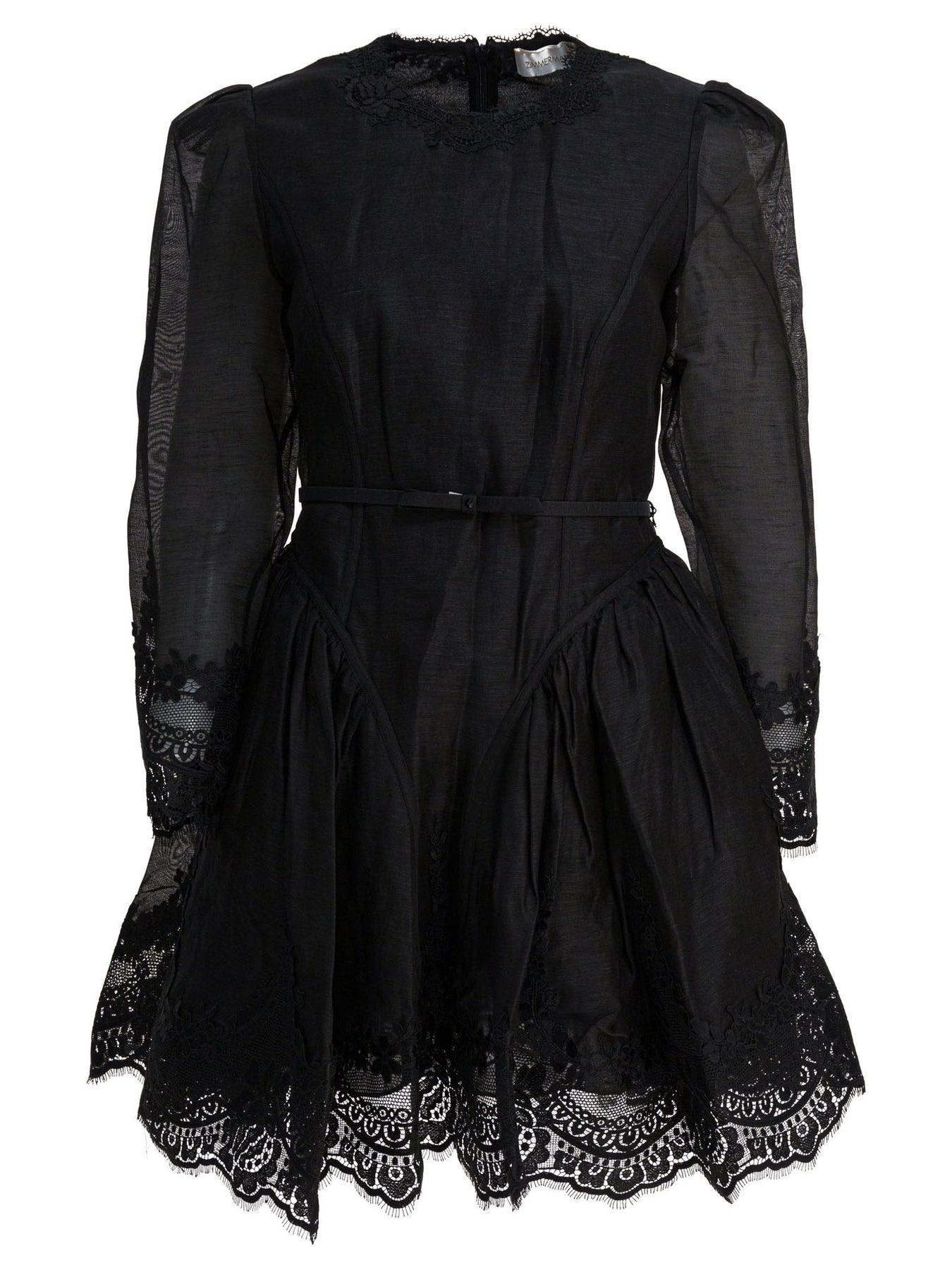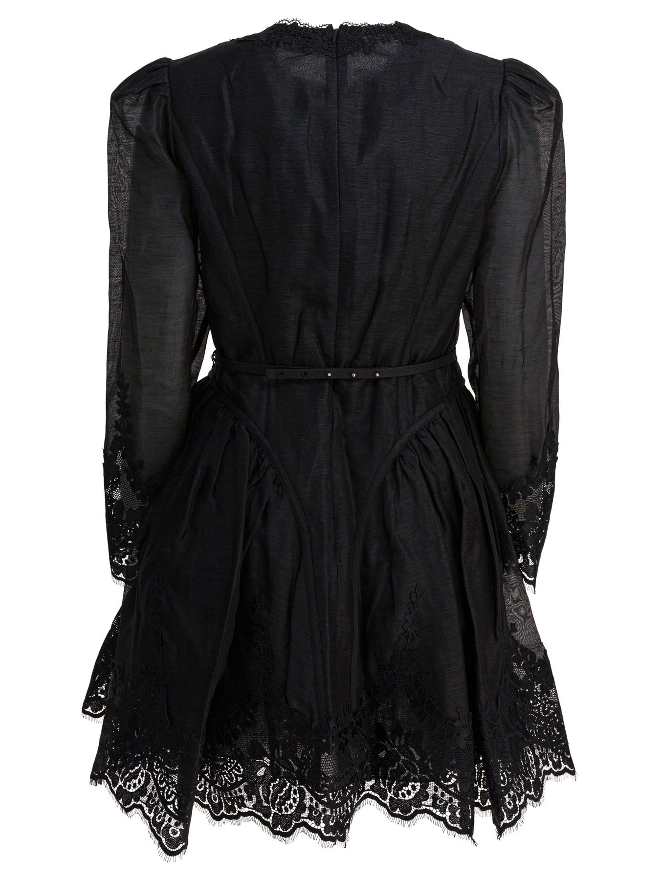 Hypnotic lace mini dress Zimmermann made of silk and linen. The construction features a flared silhouette, defined by a wide skirt enriched with tulle inserts that add volume. The garment features a rounded neckline, long sleeves with gathered shoulders and lace trim applied to the neckline, cuffs and hem. Back closure with invisible zipper and inner lining. Removable belt with matching bow. || - Solid color - Flared - Long sleeves - Lace details on neckline, cuffs and hemline - Tulle inserts in skirt - Removable belt with bow - Gathered shoulders - Invisible back zipper closure - Lined garment - Composition: 53% linen, 47% silk - Regular fit