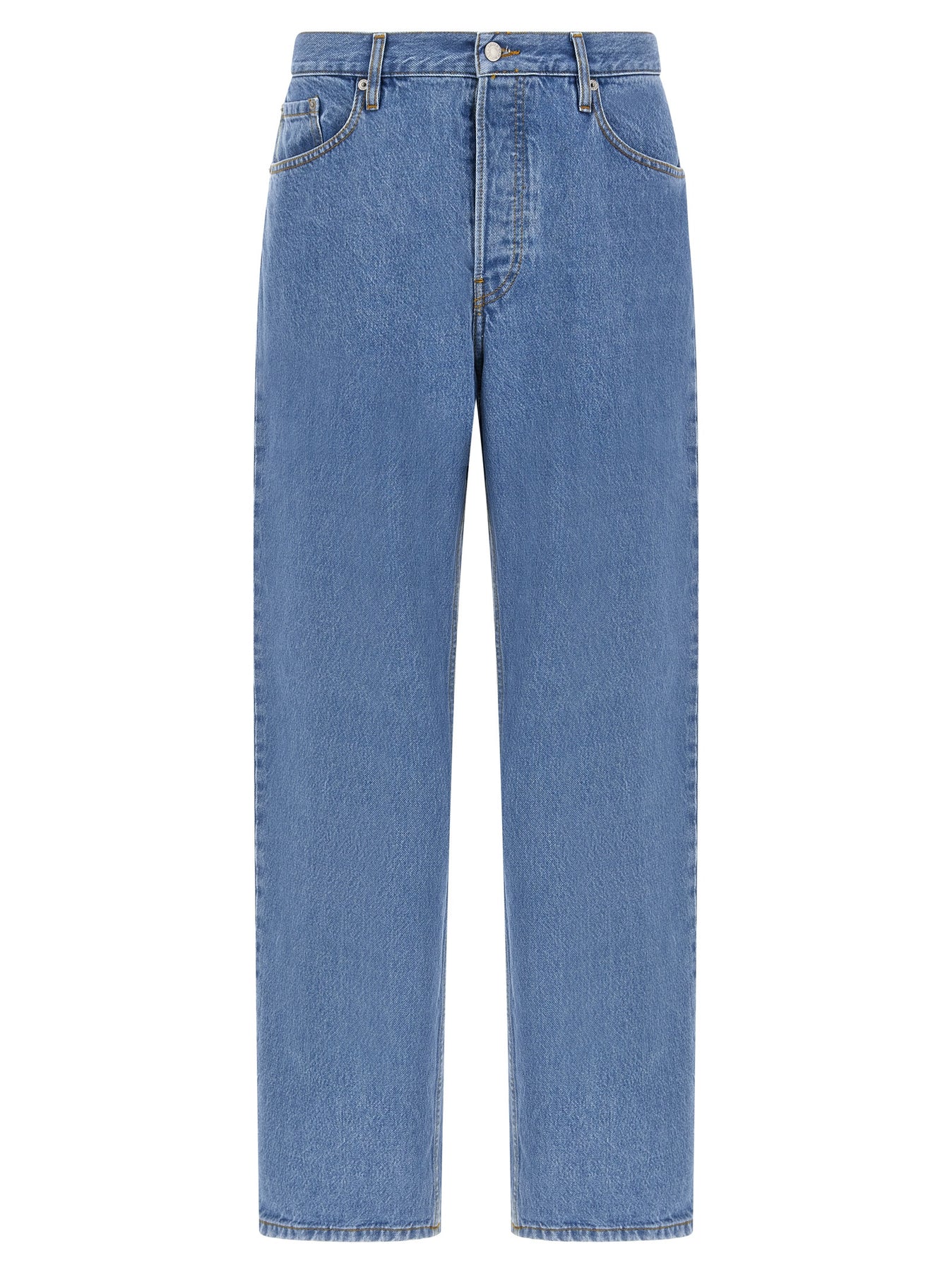 'Pine' medium waist cotton denim jeans with straight and wide leg, button closure, five pockets, leather logo label at the back.