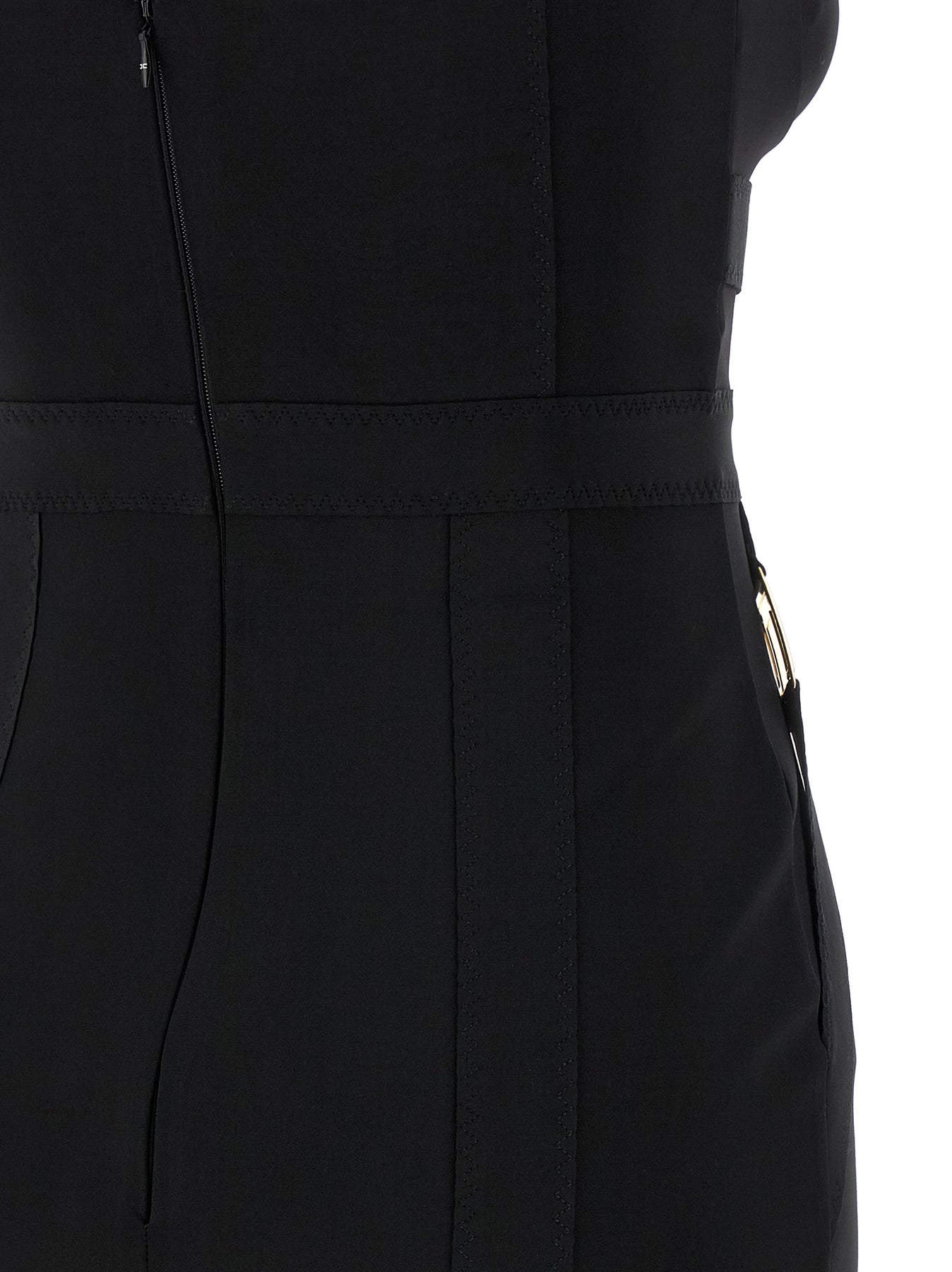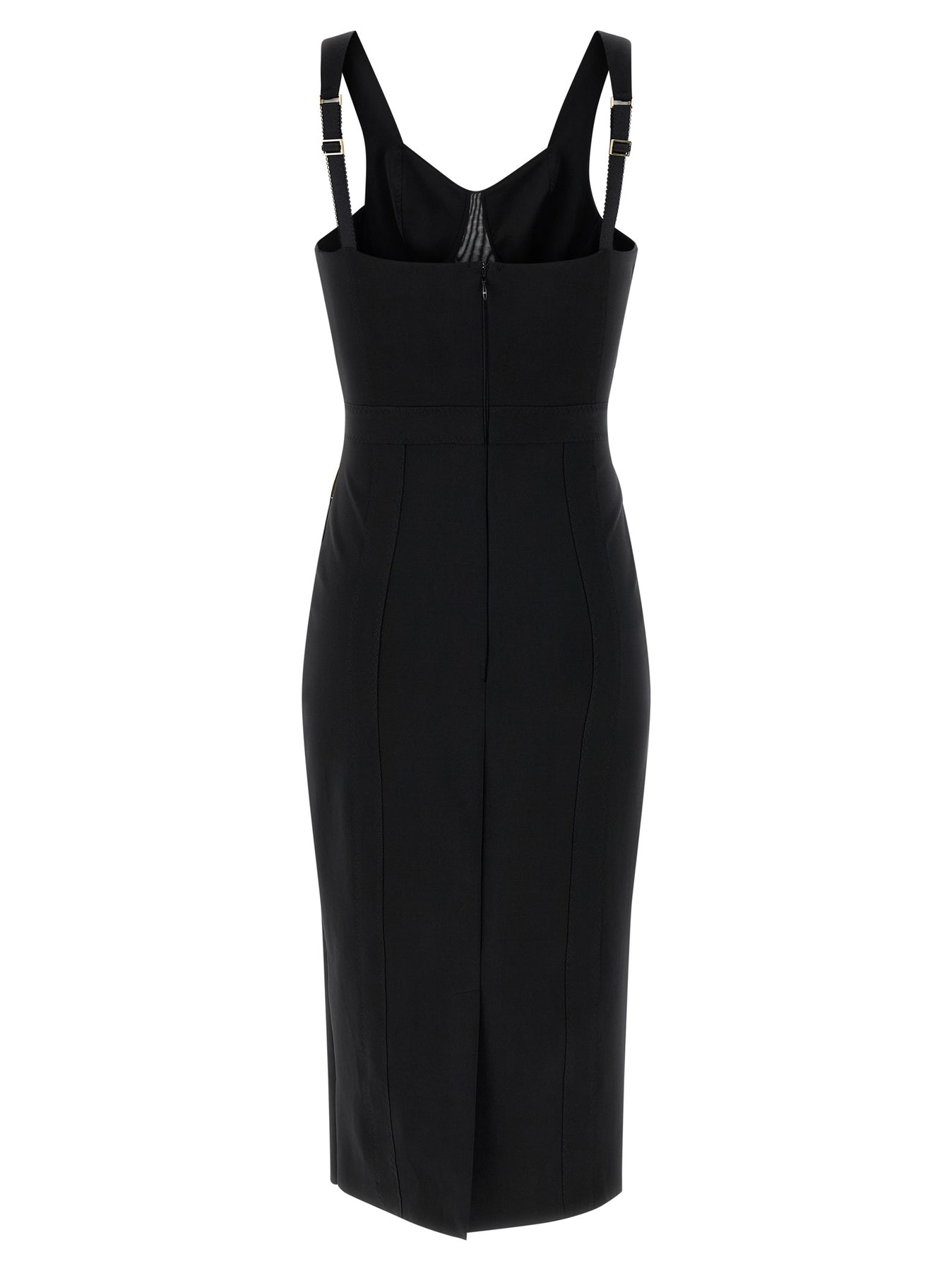 Corsetry-inspired midi dress in bielastic fabric with zigzag stitching and bustier-effect cuts, sweetheart neckline with tulle insert, adjustable straps, strap detail with metal logo on the sides, sleeveless, zip closure and back split, unlined.
