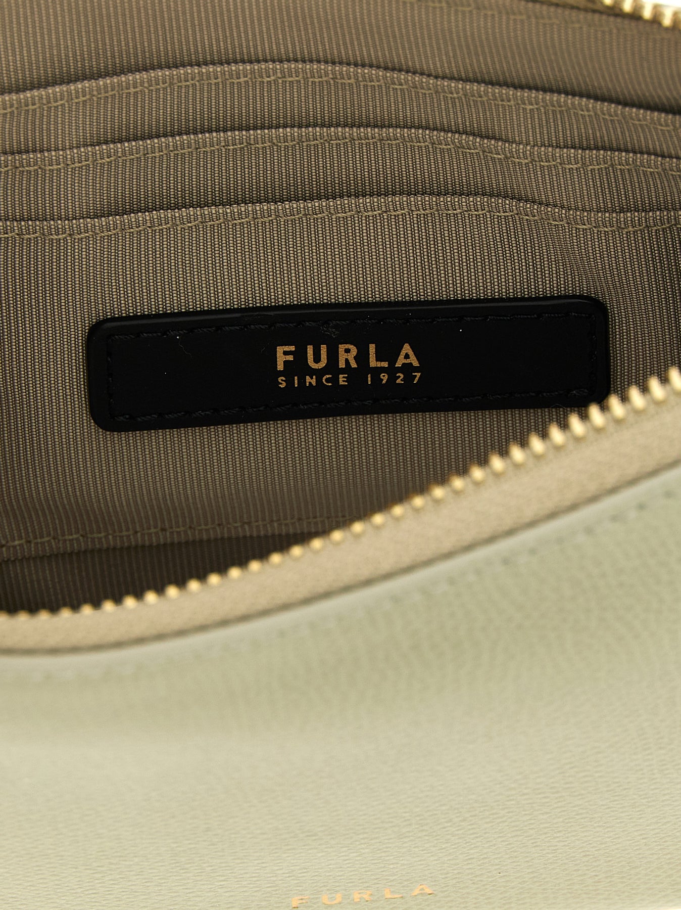 'Furla Sfera' mini shoulder bag in printed leather, half-moon model, front embossed logo, removable resin chain handle with ball pendant detail, top zip closure.
