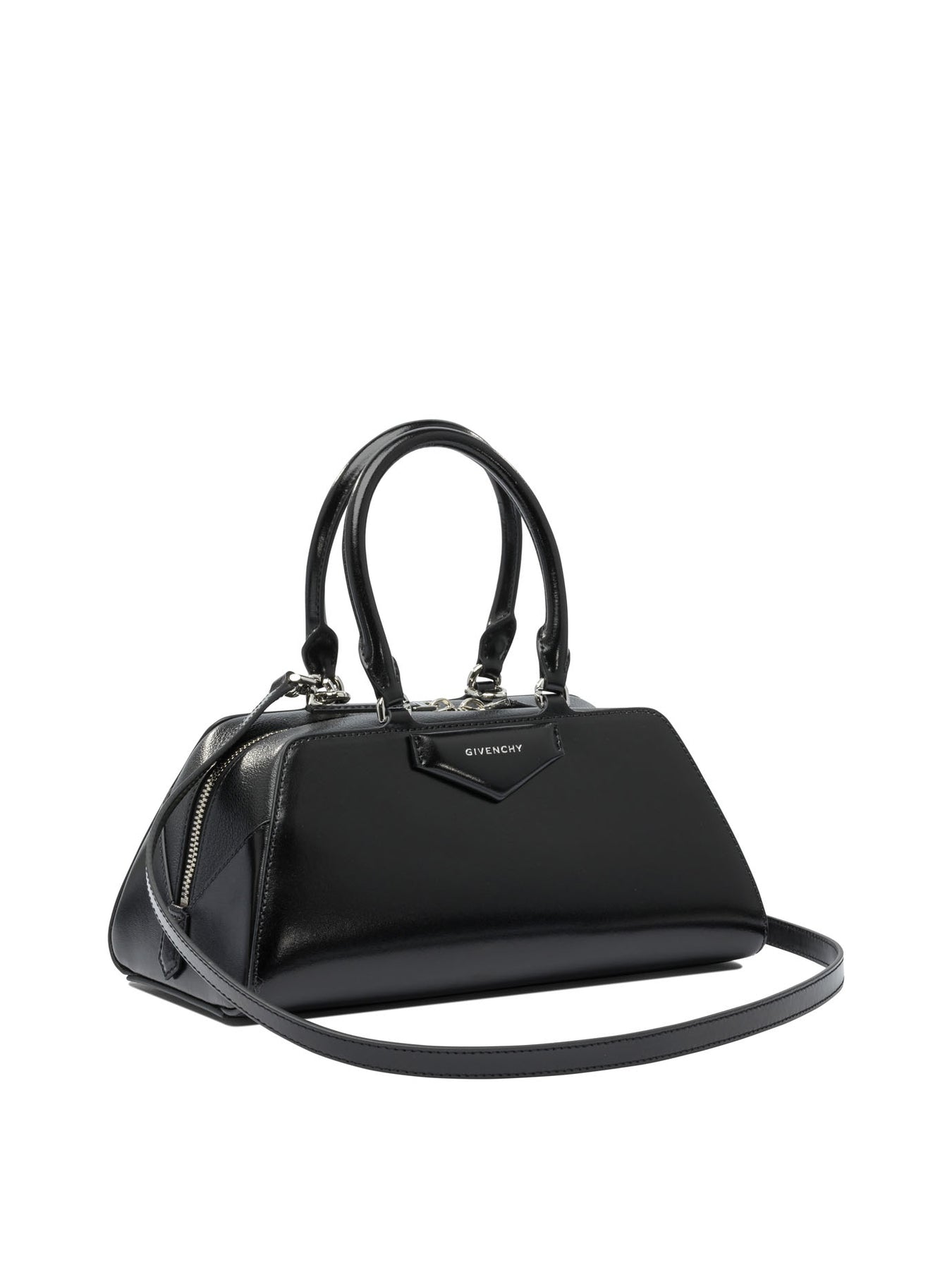 Givenchy "Antigona East-West" handbag made of Box calfskin and shiny grain leather. The structure features an elongated silhouette characterized by origami-style structured side gussets. Top zipper closure. Articulated leather handles fitted with four metal D-rings, designed to allow attachment of the adjustable and removable leather shoulder strap. Front pentagonal applique with embossed Givenchy signature. || - Box calfskin and polished grain leather - Bellows structure and East-West silhouette - Articulated handles with four metal D-rings - Adjustable and removable leather shoulder strap - Zipper closure - Pentagonal Givenchy embossed logo applique - Metallic details with silver finish - Main compartment with interior card slot