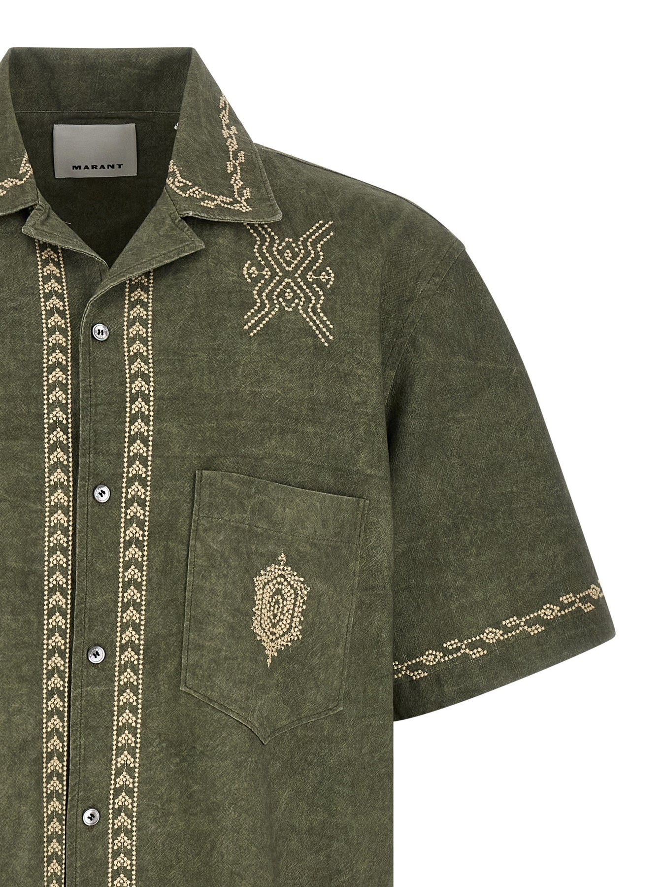 'Zekim' cotton gauze shirt with contrasting embroidery, bowling style, breast pocket, front button closure, short sleeves with dropped shoulders, side slits, asymmetrical hem.