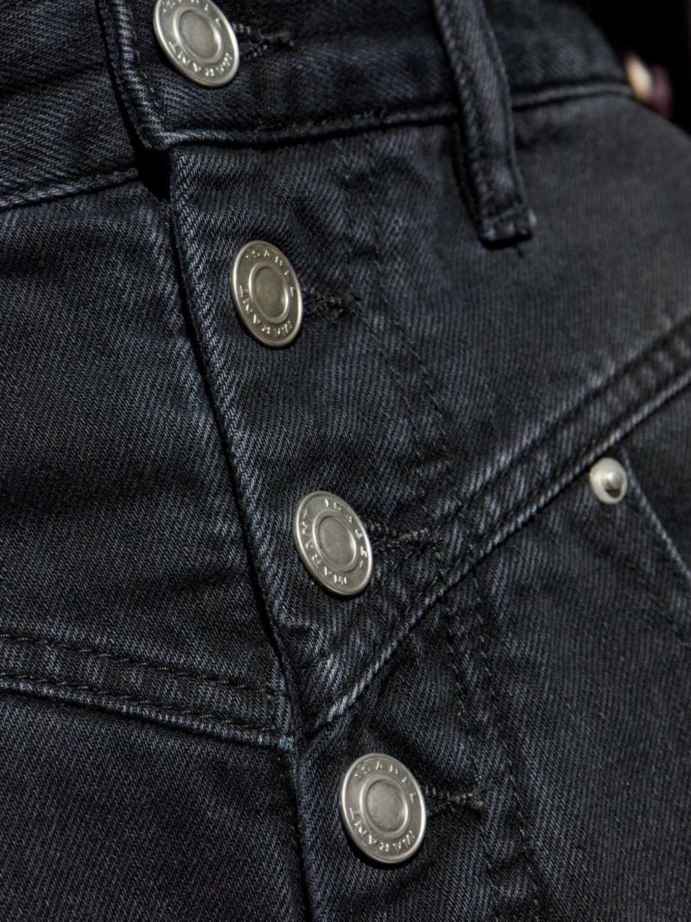 black button fly fastening belt loops classic five pockets logo patch to the rear