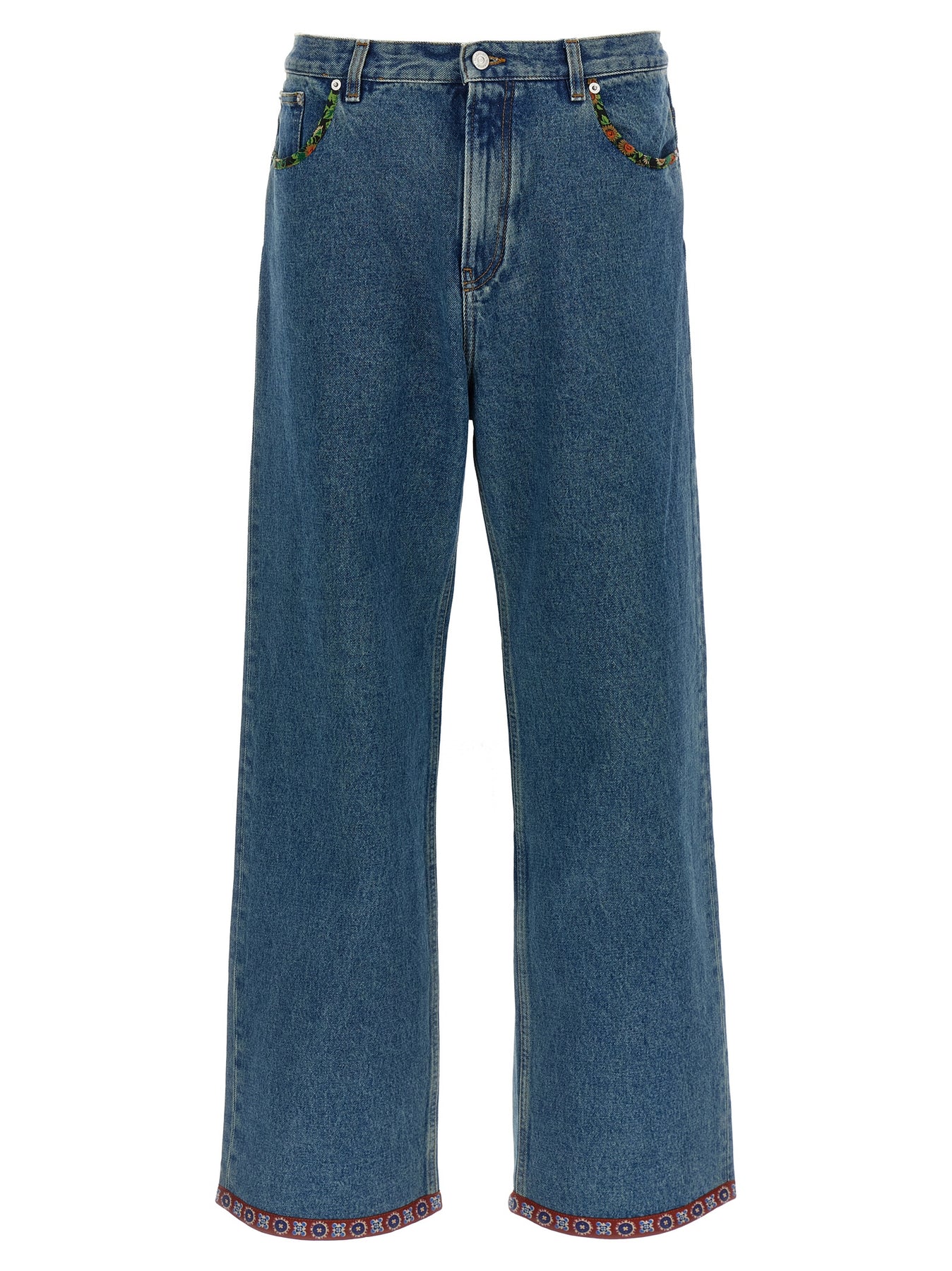 Cotton denim jeans with floral print cotton inserts, front zip and button closure, five pockets, straight leg, leather logo label at the back.