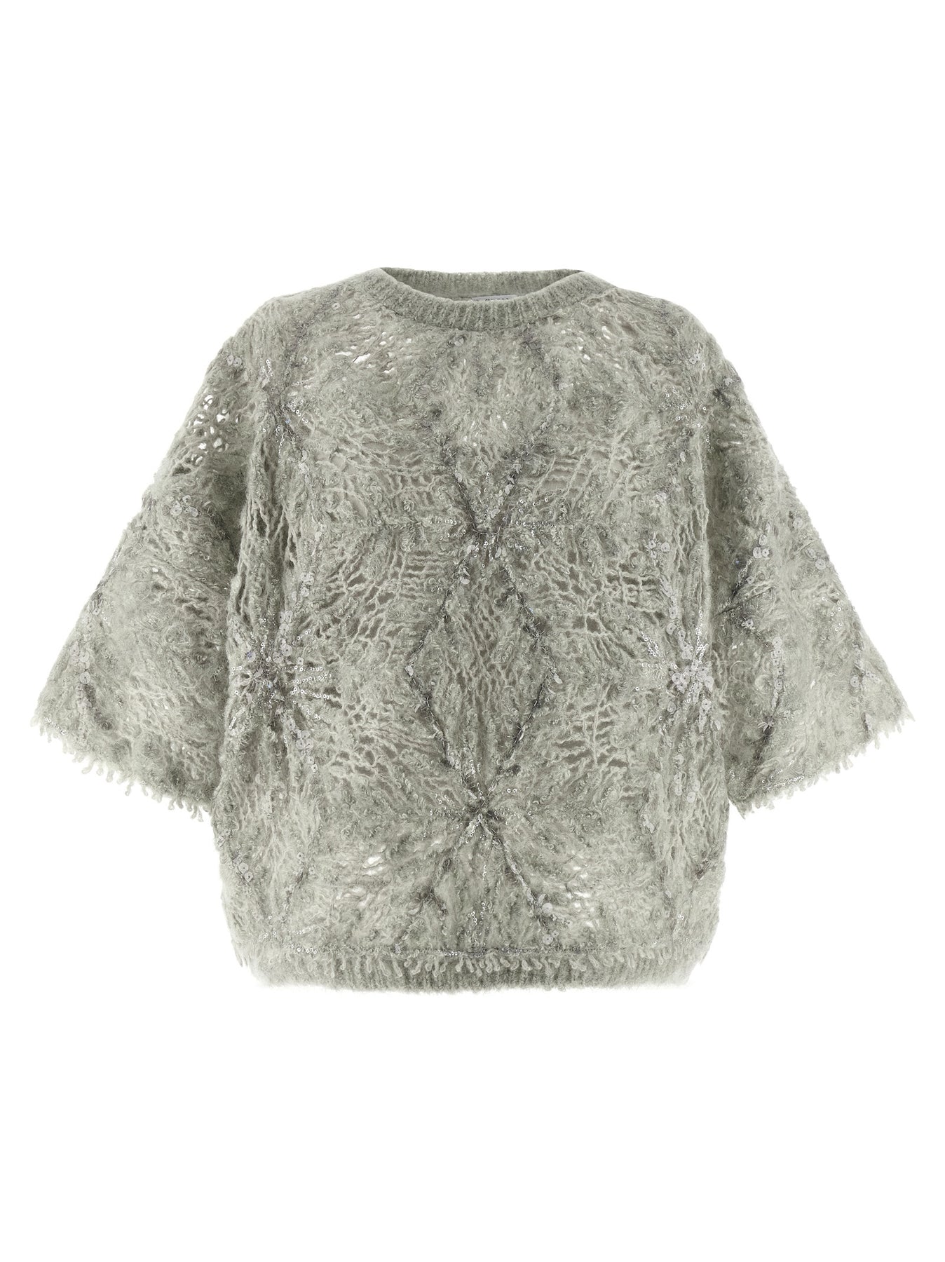 Mohair and wool blend sweater knitted with wide weave with sequins, crewneck, and short sleeves.