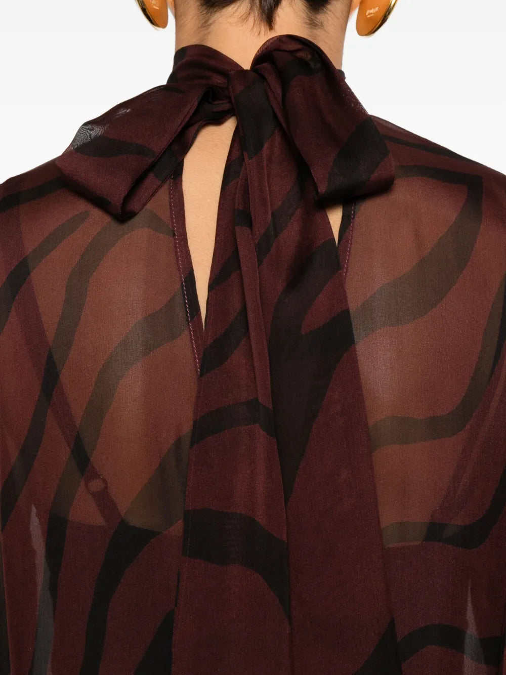 Zebra Print Dress Burgundy red zebra print, high neck, long sleeves, keyhole detail on the back, and lace-up back closure Origin: Italy Composition 100% fabric Washing Instructions Read the manufacturer`s instructions ID 5L03059