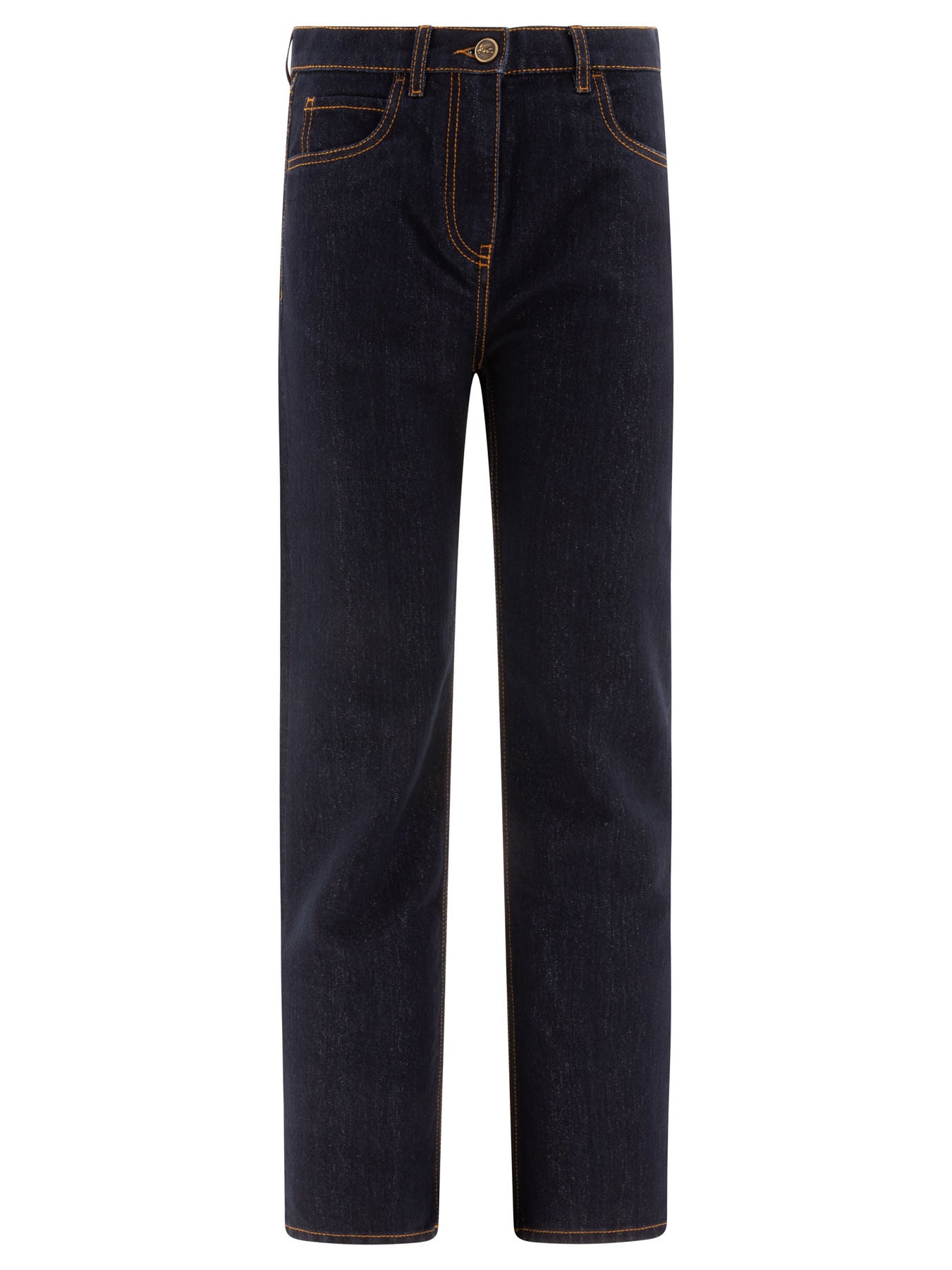 Etro's straight jeans represent casual elegance with a twist, perfect for any woman who wants a combination of comfort and style in her wardrobe. With their regular fit, they are ideal for those looking for versatile and easy-to-match garments. The solid color makes these jeans a true classic, adaptable to multiple looks. || - Regular fit - High waist - 5-pocket design - Contrast stitching || Suggested pairings include a white shirt for a sophisticated look, a leather jacket for a grittier outfit or a shoulder bag for a practical touch. Complete the look with ankle boots or athletic shoes for a chic, casual effect.