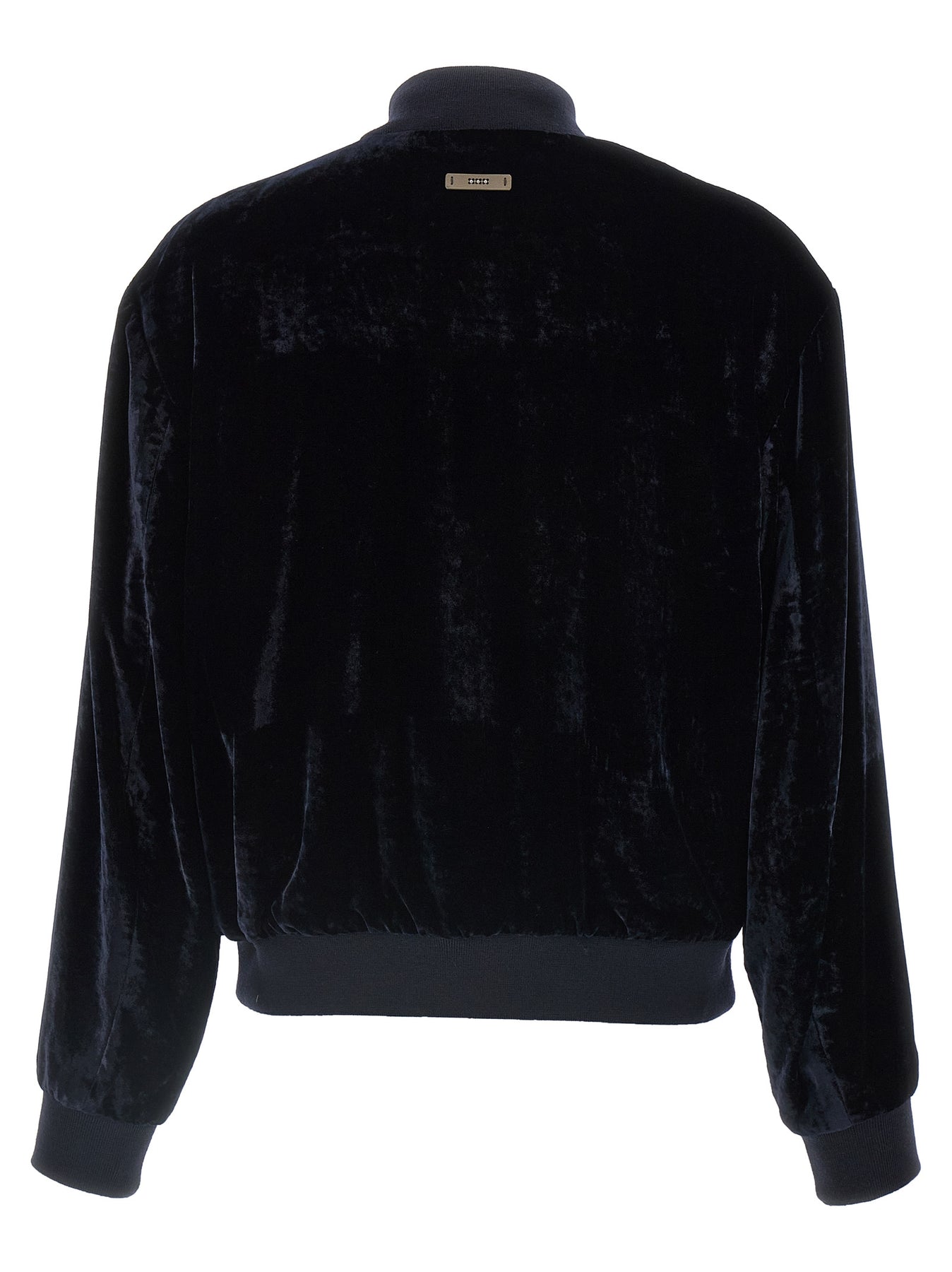 Washed viscose velvet bomber sweatshirt with stretch ribbed knit details, front zip closure, pockets, long cuffed sleeves.