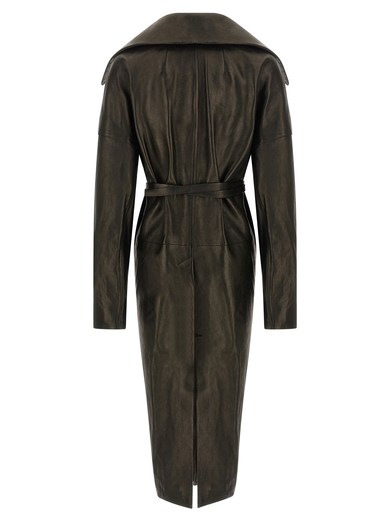 'Dracucollar Belted' vegetable-tanned cow leather coat finished with natural waxes, maxi collar, wallet style with belt closure, hourglass silhouette, pockets, long sleeves with zip on the sleeve bottom and dropped shoulders, lining. Since this leather is not finished with pigments that cover it, the natural signs and shades that make each skin and each product unique are visible.