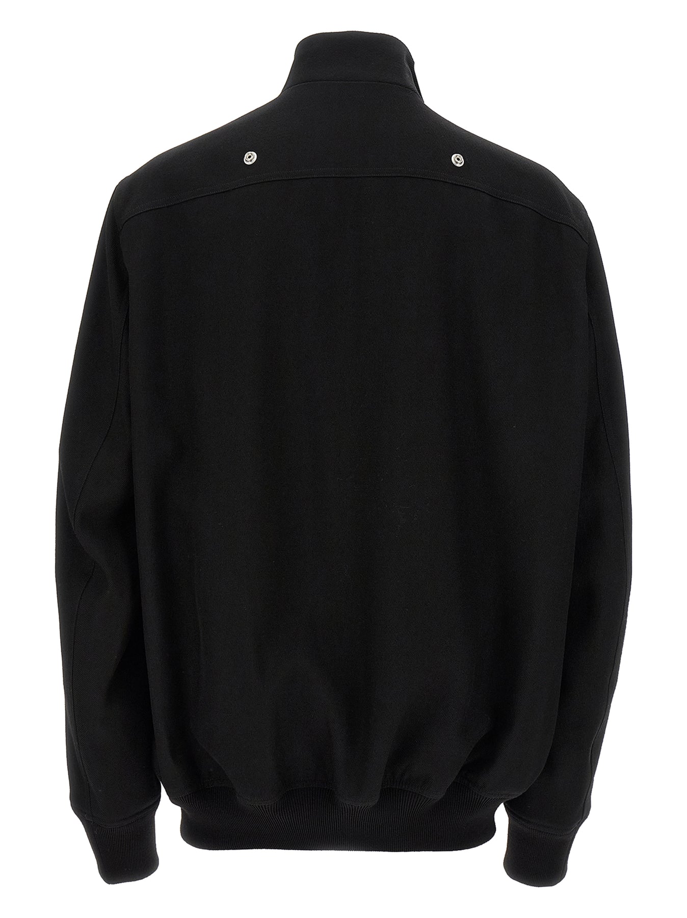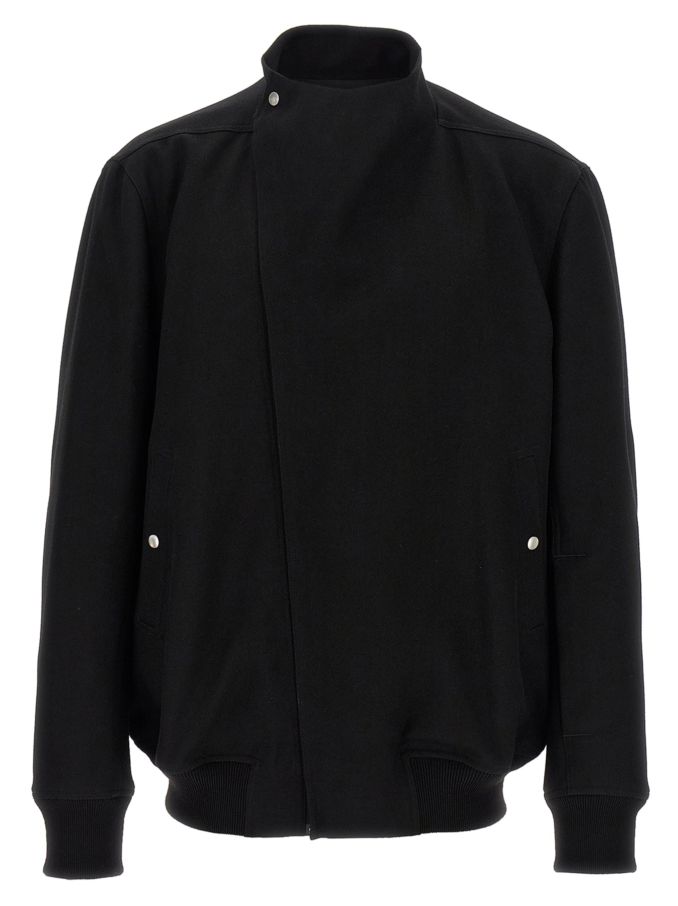 'Hollywood Flight' heavy cotton bomber jacket with stretch ribbed cotton knit details, lining, zip closure and oblique front snap button, pockets, long cuffed sleeves.