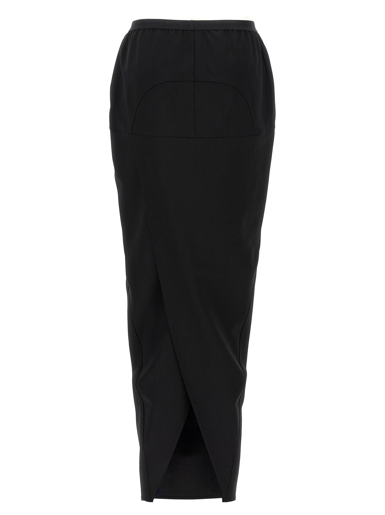 'Soft Pillar Long' skirt in wool blend, elastic waistband, asymmetrical, back split.