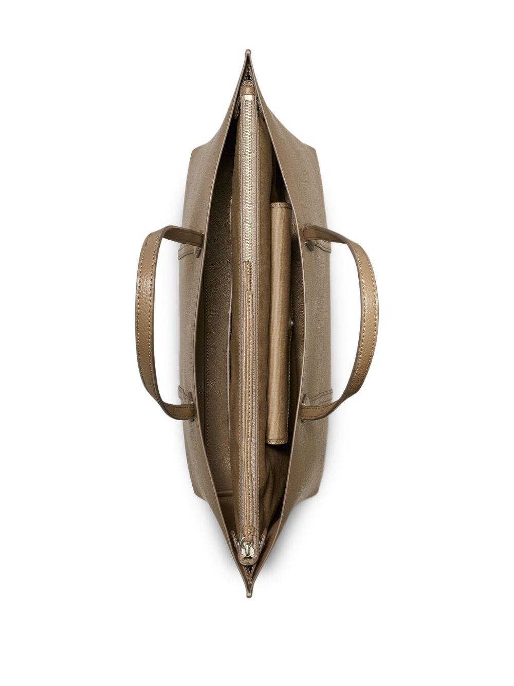 brown dual top handles embossed logo detail open-top design structured silhouette