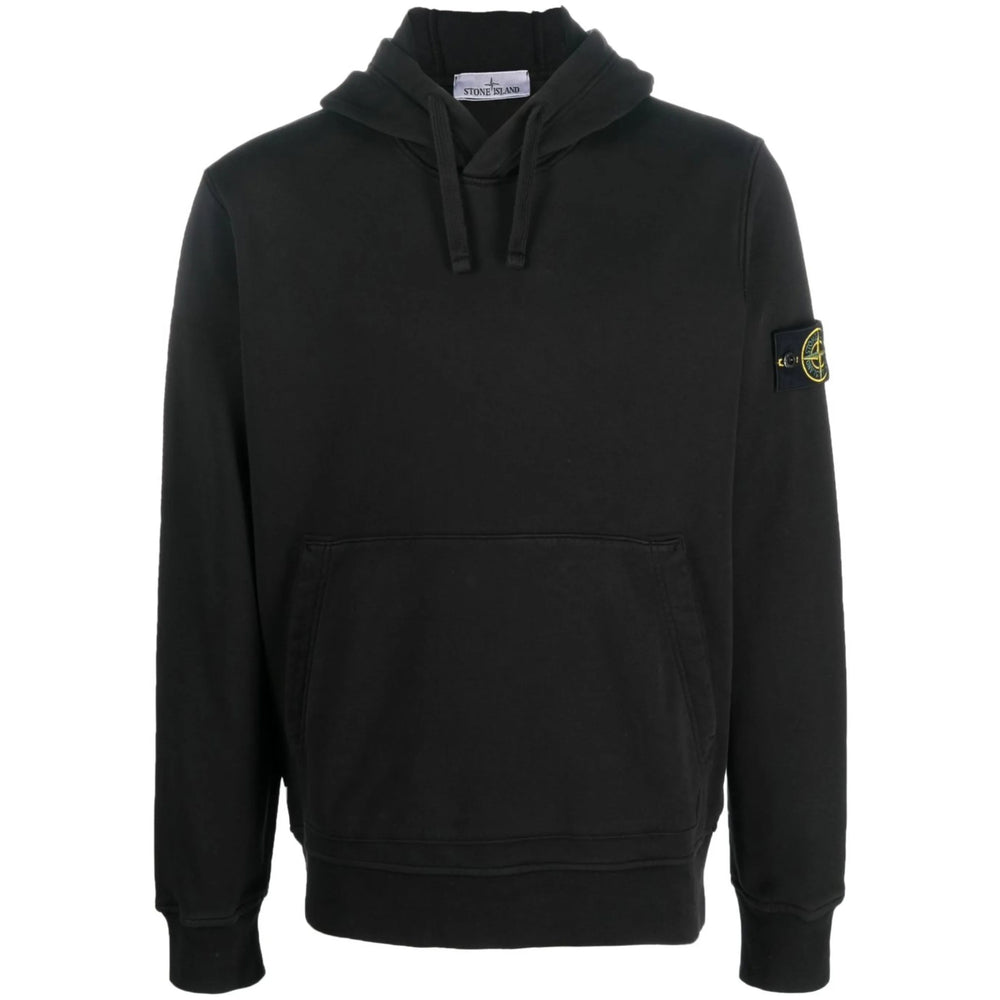 black cotton signature Compass motif logo patch at the sleeve drawstring hood front pouch pocket long sleeves straight hem