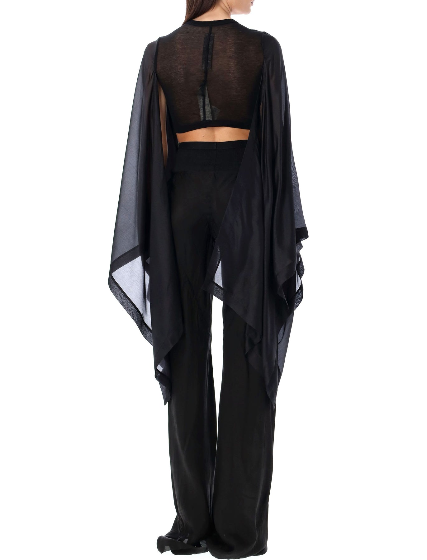 Black crop top from Rick Owens in cotton and silk, long rectangular sleeves with flag opening in contrasting fabric, round neckline.
