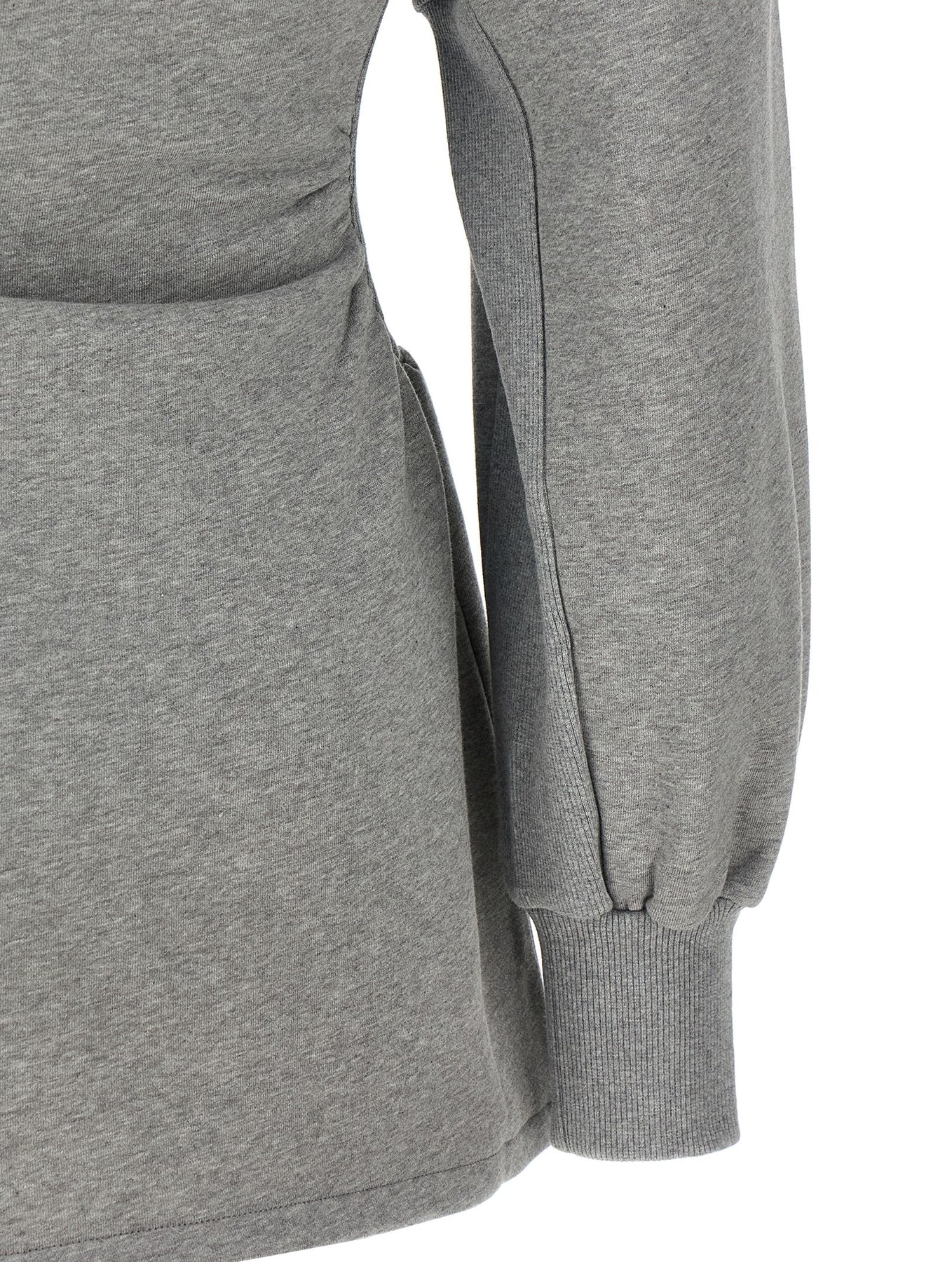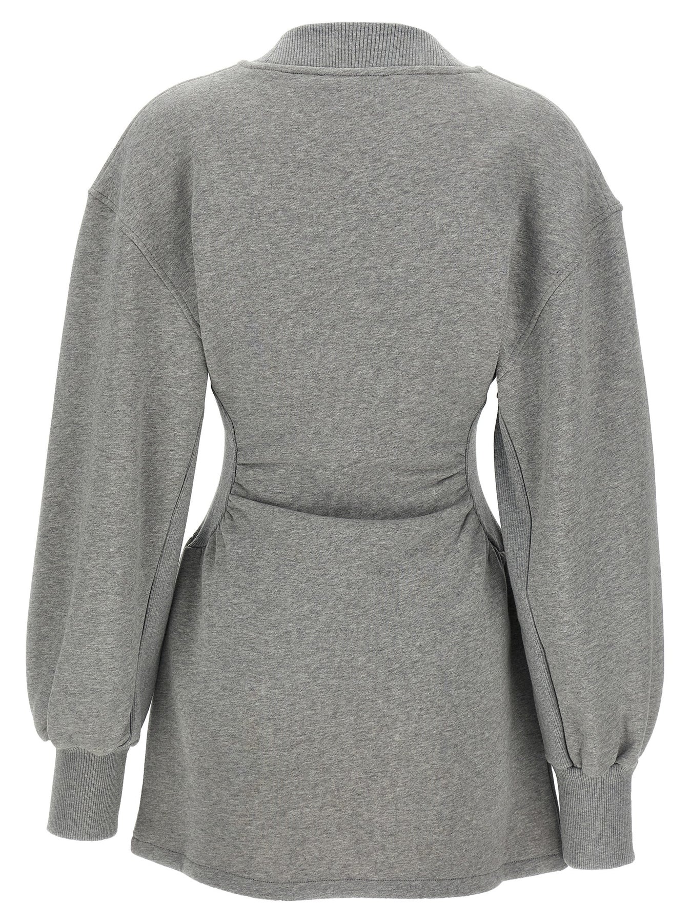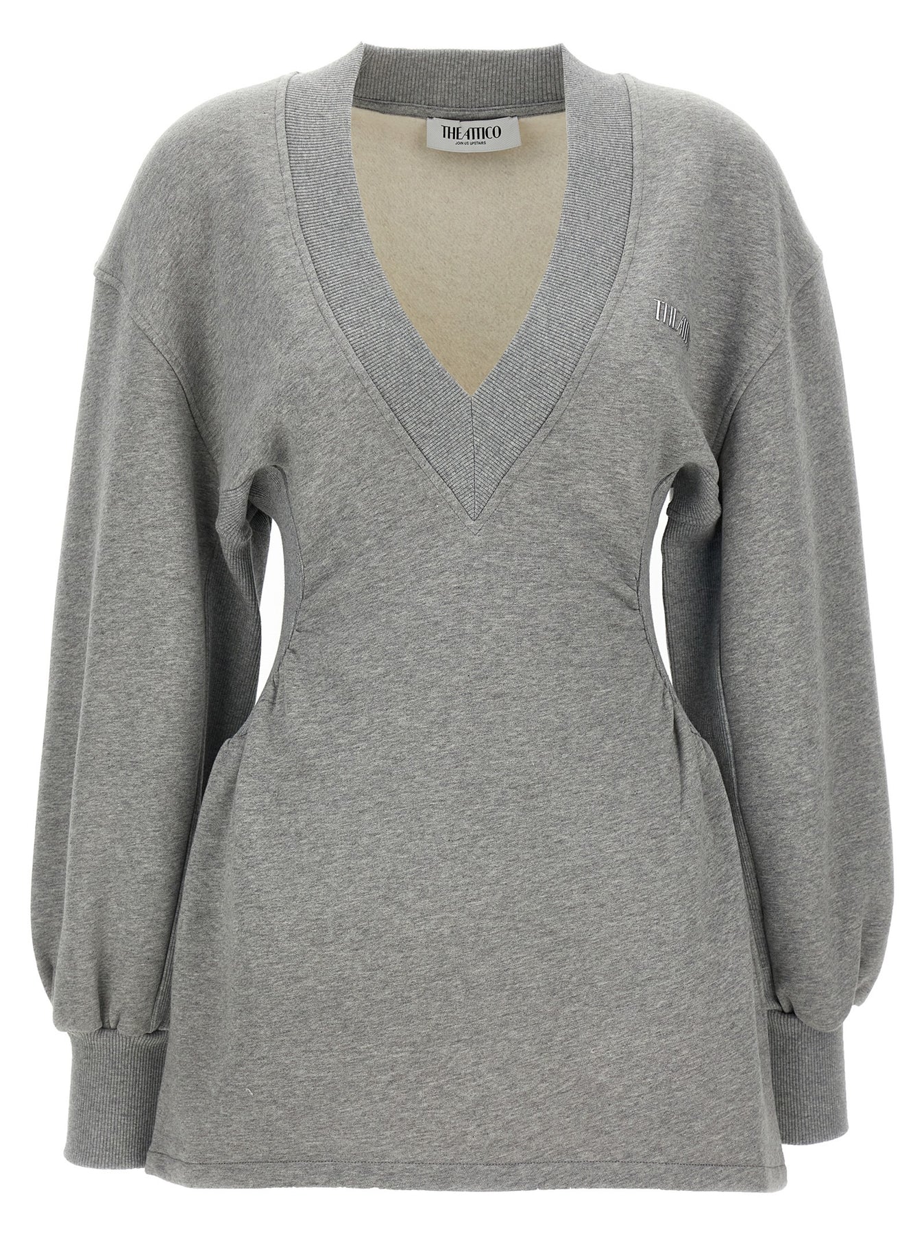 Fleece mini dress, V-neck, front embossed logo embroidery, long cuffed sleeves, ribbed stretch cotton side inserts.