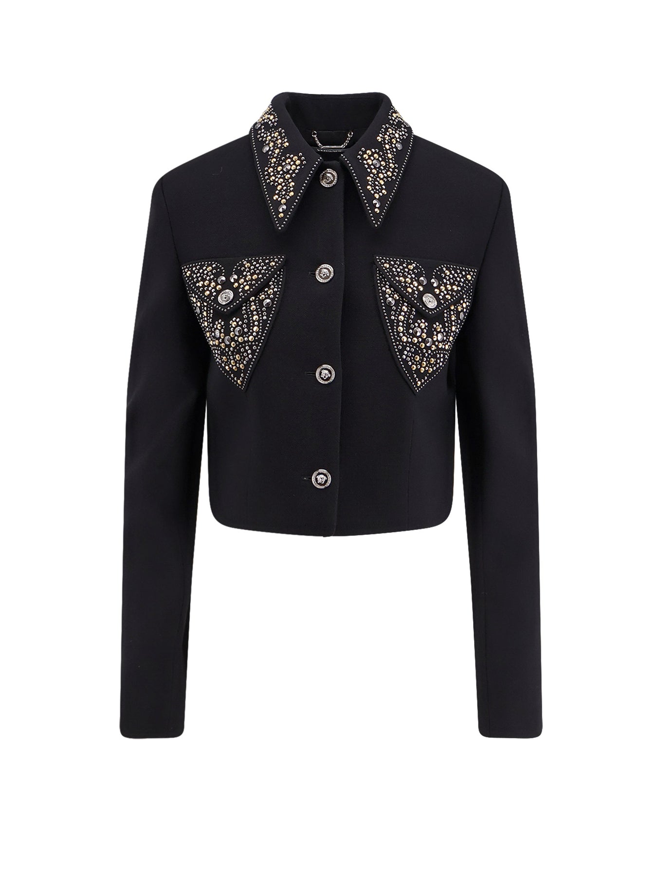 Medusa button closure Pointed collar with silver/gold metal studs Front flap pockets with Medusa button Long sleeves with iconic button Made in Italy 90% wool 10% polyamide Lining: 100% cupro SKU: 10213191A127891B000