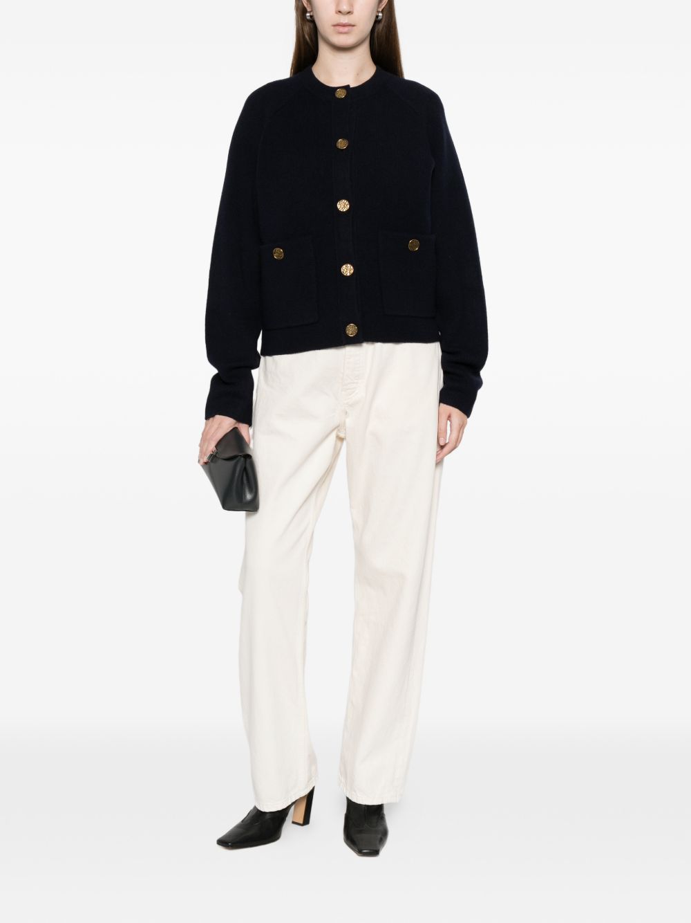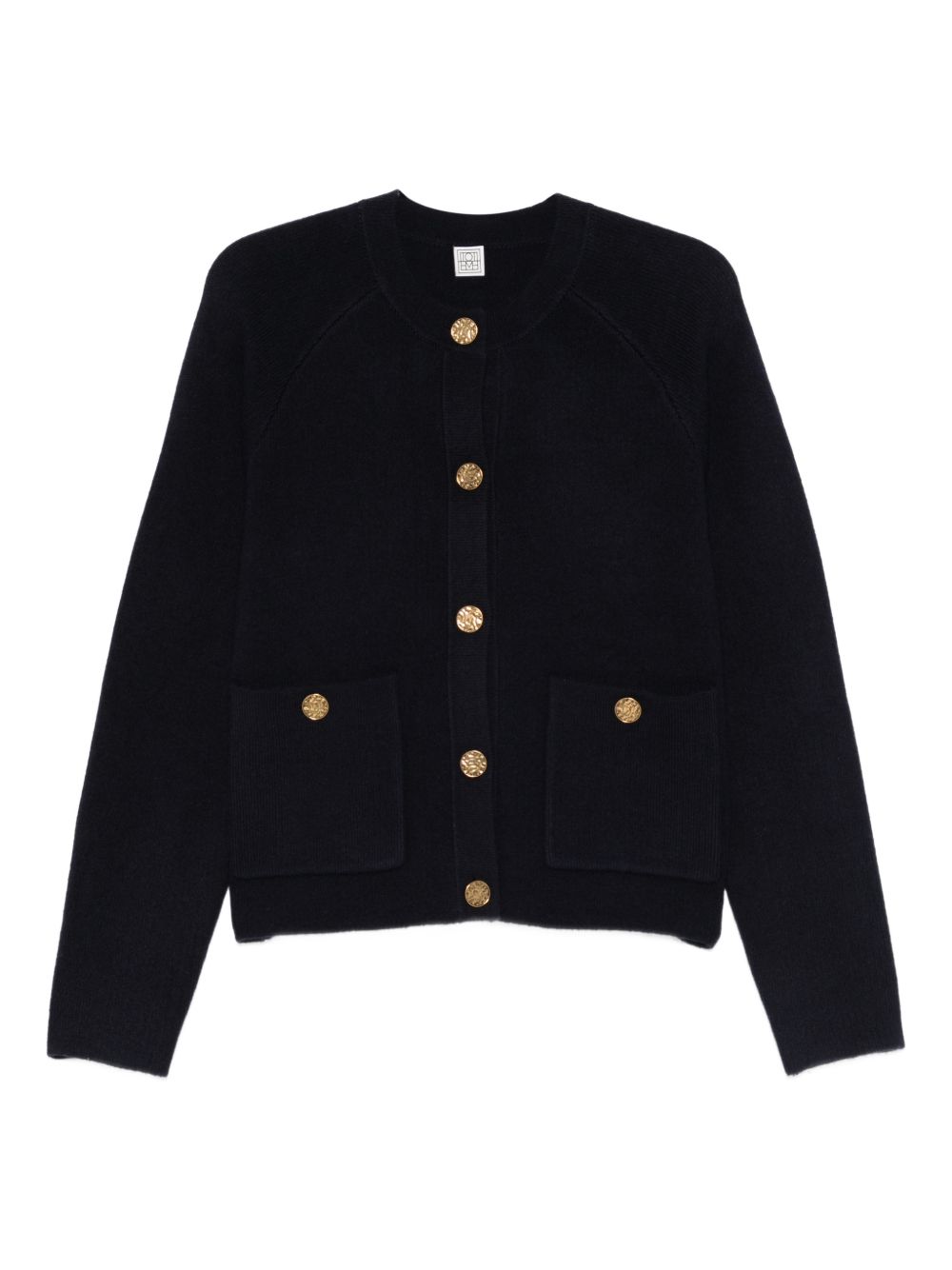navy blue hammered buttons two front pockets round neck long sleeves ribbed trims