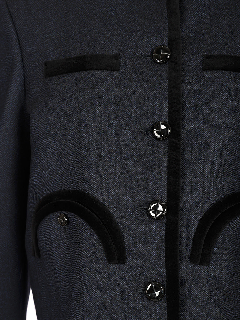 "Maine" virgin wool bolero jacket by Blazè, with velvet profiles, front button fastening and Smiley pockets
